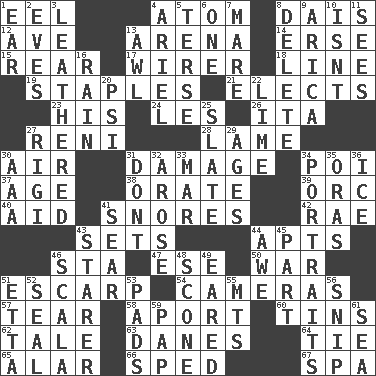 ACROSS 1. Snakelike fish 4. Smallest unit of an element 8. Raised platform 12. "___ Maria" 13. Sports stadium 14. Celtic language 15. Hitchcock's "____ Window" 17. One who wires 18. Actor's bit 19. Paper fasteners 21. Chooses 23. Part of HMS, perhaps 24. French article 26. Call ___ day 27. Painter Guido (1575-1642) 28. Unable to walk 30. Wind 31. Break 34. Luau course 37. Ripen 38. Speak pompously 39. The grampus (Milton) 40. Help 41. Sounds asleep 42. Actress Charlotte 43. Puts into a specified state 44. Tenement units (abbr.) 46. R.R. building 47. Compass dir. 50. Armed conflict 51. Fortification 54. Devices for capturing images 57. Pull into pieces 58. To the left, to Queeg 60. Metal containers 62. Lie 63. Natives or inhabitants of Denmark 64. Neckwear 65. Having or resembling wings 66. Broke a traffic law 67. Health resort DOWN 1. Ewer handle 2. Nights before holidays 3. Resembling or made to resemble leather 4. Satellite of Uranus 5. Laconic 6. Single 7. Female horse 8. Erase 9. N. Chile seaport 10. Is not 11. Observes 13. Leather borer 16. Precipitation 20. 23rd letter of the Greek alphabet 22. Citrus frut 25. Chalkboard 27. Swiss mountan, "Queen of the Mountains" 29. Ripens 30. American Automobile Association (abbr.) 31. Do not 32. Came up 33. Make imperfect 34. Likenesses of persons 35. Mouths or openings 36. Frozen water 41. Shrivel 43. A viewer who gazes fixedly 44. Deep reverence 45. Component 46. Any of the three canals of the cochlea 48. Biscuitlike quick bread 49. Having ears or earlike features 51. Singer James 52. Lick closed 53. Groovy apts. 55. Mountains (abbr.) 56. Sever or remove by pinching or nipping 59. Infant food 61. Ocean