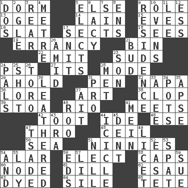 ACROSS 1. Dormintory (informal) 5. Otherwise 9. Hero or heavy, e.g. 13. Double curve, resembling the letter S 14. (Had) reclined 15. Nights before holidays 16. Narrow board 17. Religious groups 18. Perceives with the eye 19. Tendancy to err 21. Storage container 22. Give off 23. Soap bubbles 24. Pacific Standard Time (abbr.) 27. ___ a Wonderful Life 28. Method 29. Hold, grip (Informal) 31. Writing instrument 32. California wine valley 36. Old wives' tales, e.g. 37. Tate display 38. Hoof sound 39. Portico 40. _ de Janeiro 41. Confronts 42. A blast of a horn 44. Binary compound 46. Compass dir. 47. Through, poetically 48. To provide with a ceiling 50. Ocean 51. Fools 54. Having or resembling wings 56. Voters do this 58. Smile enhancers 60. Connecting point 61. Deli pickle 62. Son of Isaac 63. Colored 64. Filth; sediment 65. Wig DOWN 1. Two (Sp.) 2. Stare at amorously 3. Bring up, as a child 4. Distance measurement (Brit.) 5. Chooses 6. Made of lace 7. Be seated 8. Followers of ems 9. Home 10. Baking chambers 11. Area sheltered from the wind 12. Curvy letter 17. In a ____ (agitated or irritated) 20. Among 21. Partially opened flower 23. Boy, to dad 24. Friends 25. Opportunity 26. "Corrida" creature 28. Was introduced to 30. Resembling or made to resemble leather 31. Adept person 33. Toward shelter 34. Plant holders 35. Domed church section 37. Small island 40. Friend of Pooh 41. Count _ (2 wds.) 43. Mouth or opening 44. Ice on the eave 45. Gouge 47. Sadhe (variant) 49. It is permitted: Lat. 51. 1994 drama film starring Jodie Foster 52. Comfort 53. Petty quarrel 54. Also 55. Myrna of the movies 56. Begley and Asner 57. Cards in a Roman deck? 59. Institute legal proceedings