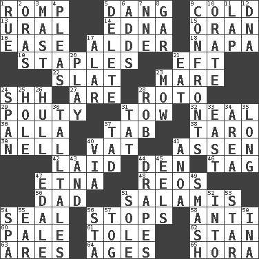 ACROSS 1. Play 5. Mild oath, euphamism for damn 9. Chilled 13. Mountain range 14. Pulitzer Prize-winning author Ferber 15. Northwest Algerian city 16. Relaxation 17. Tree or shrub in the Birch family 18. California wine valley 19. Paper fasteners 21. Lizard (obsolete) 22. Narrow board 23. Female horse 24. Quiet! 27. "We ___ not amused" (Victoria) 28. Printing process, for short 29. Marked by pouting 31. Pull behind 32. Anneal 36. Silent film actress Nazimova 37. Bar bill 38. Pacific island yam 39. 1994 drama film starring Jodie Foster 40. Large container 41. NE Netherlands city 42. Put down 44. Lair 46. Label 47. Inactive volcano in Sicily 48. Vintage cars 50. Male parent 51. Deli grouping 54. Lick closed 56. Halts 58. Against 60. Light colored 61. Lacquered or enameled metalware 62. Comedian Laurel of Laurel & Hardy 63. Ancient Greek god of war 64. Eons 65. Israeli folk dance DOWN 1. Regret 2. Mouths or openings 3. Vertical spar for supporting sails 4. Entreaties 5. Keyboard key 6. Sums up 7. Compass dir. 8. Slender fish 9. Meets 10. Declaim 11. Pet locale 12. Heredity factor (abbr.) 17. Having or resembling wings 20. Frolic 21. Consume 23. Cut the grass 24. Connect, as a bridge 25. Opening into or through something 26. Frame or body of a ship 28. Director Reiner 30. Baron Munchausen's specialties 31. Make lace 33. 90 degrees 34. Type of rug 35. Protracted 37. Bit 40. By way of 41. Small Philippine buffalo 43. Added to 44. Window treatments 45. Snakelike fish 47. Peak District village in England 49. Box-office sellout 51. Not divided or shared with others 52. To the inside or interior of 53. Play the lead 54. Health resort 55. Hearing organ 56. R.R. building 57. Coat; cloak 59. _ tizzy (2 wds.)