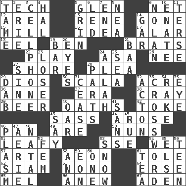 ACROSS 1. Technical work 5. Small, secluded valley 9. Fish or hair follower 12. Type of rug 13. French philosopher Descartes 14. Went 15. Place where flour is made 16. The main thing one is thinking about 17. Having or resembling wings 18. Snakelike fish 19. Benjamin's nick name 21. Naughty children 22. Live dramatic performance 24. White ___ sheet 26. Born 27. Dinah or Pauly 28. Entreaty 29. "Vaya con ____" 30. Any of the three canals of the cochlea 32. 43,560 square feet 36. Queen of England 1702-14 37. Epoch 38. Supercomputer manufacturer 39. Fermented drink made from hops 40. Expletives 42. Puff or smoke 43. Backtalk 44. Came up 46. Baking dish 49. "We ___ not amused" (Victoria) 50. Religious women 51. Like summer trees 53. Compass dir. 54. Soggy 57. Johnson of "Laugh-In" 58. Period of immesurable duration 61. Lacquered or enameled metalware 62. Thailand, formerly 63. Words to Nanette 64. Celtic language 65. Cartoonist voice _ Blanc 66. Afresh 67. Arabian gulf DOWN 1. Not wild 2. 4th largest of the Great Lakes 3. Portable communications device 4. Actor Linden 5. Broad smile 6. Directed 7. Compass dir. 8. Teachers' org. 9. Pitcher Ryan 10. Maternal 11. Laconic 14. Slender fish 19. Soap unit 20. Snake ____ (dice throw) 21. Sound made by sheep 23. Failure 24. Assad's deity 25. Ocean 27. Trig term 28. Components 29. Apply (a substance) by light strokes 31. Desist 32. NE Massachussets city 33. What you're doing now 34. Immoral or dissolute person 35. Sight organ 40. Boat paddle 41. Without 43. Declare 45. Sorrow 46. Suffix with ecto or cyto 47. Nest on high 48. Relating to or accompanying birth 52. Opposite of masc. 53. Frozen precipitation 55. Otherwise 56. Adolescent 58. Santa ___, CA 59. A really long time 60. Single 61. Afternoon social gathering