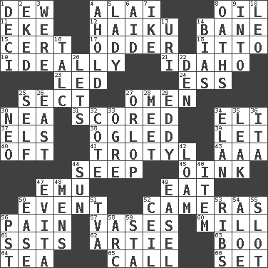 ACROSS 1. Morning condensation 4. Mountain range southwest of Kyrgyzstan 8. Lubricate 11. Supplement with great effort 12. Japanese poetic form 14. Object of repulsion 15. Certainty 17. More peculiar 18. "Tell ____ the Marines!" 19. Under perfect conditions 21. Potato state 23. Directed 24. Double-curved letter 25. Religious group 27. Presage 30. Teachers' org. 31. Tallied 34. Connecticut Ivy Leaguer 37. Raised railways 38. Stared at amorously 39. Allow 40. Often (poetically) 41. Trinitrotoluene 43. American Automobile Association (abbr.) 44. Ooze 45. Pig sound 47. Australian flightless bird 49. Consume 50. Happening 52. Devices for capturing images 56. Ache 57. Flower holders 60. Place where flour is made 61. Fast planes 62. Nick name for Arthur 63. Surprise greeting 64. Afternoon social gathering 65. Give a ring to 66. Put into a specified state DOWN 1. Tenth: prefix 2. Supplemented with great effort 3. Past tense of be (plural) 4. Hold, grip (Informal) 5. Kenny Rogers chart-topper in '80 6. Help 7. D.D.E's nickname 8. Expletives 9. To the inside or interior of 10. Lion 13. RI univ. 14. Prejudice 16. Baby powder 20. Allows 22. Lair 25. Oneself 26. Compass direction 27. Fourth or lowest deck 28. Confront 29. Whirlpool 30. Modern: prefix 32. ____ d'Azur (French Riviera) 33. Legendary monster 34. Liveliness 35. Path through which fluid escapes 36. Call ___ day 42. Rich soil 44. Player for Phoenix 46. Detail 47. Webber/Rice musical 48. Not women's 49. Artist's stand 50. Comfort 51. Federal power corp. 52. To provide with a ceiling 53. Chest bones 54. _ vera 55. Narrow, elongated depression 56. Pacific Standard Time (abbr.) 58. Curve 59. R.R. building