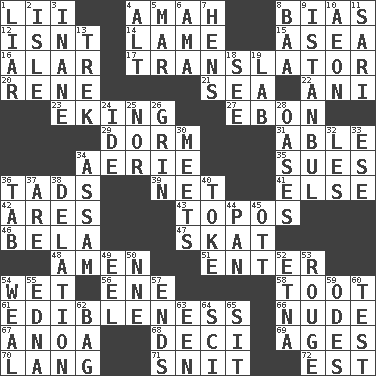 ACROSS 1. Cards in a Roman deck? 4. Nanny 8. Prejudice 12. Is not 14. Unable to walk 15. Toward the sea 16. Having or resembling wings 17. Interpreter 20. French philosopher Descartes 21. Ocean 22. Cuckoo 23. Supplementing with great effort 27. Inky black, to poets 29. Dormintory (informal) 31. Competent 34. Nest on high 35. Institutes legal proceedings 36. Small amounts or degrees 39. Fish or hair follower 41. Otherwise 42. Ancient Greek god of war 43. Literary convention 46. Actor Lugosi 47. Three-handed card game 48. So be it 51. Keyboard key 54. Dripping 56. Compass dir. 58. A blast of a horn 61. The property of being fit to eat 66. Unadorned 67. Small Philippine buffalo 68. Tenth: prefix 69. Eons 70. Long (Scottish) 71. In a ____ (agitated or irritated) 72. Eastern Standard Time (abbr.) DOWN 1. One who doesn't tell the truth 2. Capri or Wight 3. Empty; void 4. The first octave above the treble staff 5. Impair 6. Housemaid (var.) 7. Coop moms 8. Sound made by sheep 9. Byzantium, centuries later 10. Period of immesurable duration 11. Indian skirt 13. Long journey 18. Perceive with the eye 19. Experiment locale 24. Binary compound 25. Not either 26. Smile widely 28. Fertile tracts in a desert 30. Confronts 32. French article 33. Compass dir. 34. Indian state 36. Keyboard key 37. "We ___ not amused" (Victoria) 38. Accusation by an informer 40. Puff or smoke 44. Baking dish 45. Baseball player Mel 49. Snakelike fish 50. Compass dir. 52. Inactive volcano in Sicily 53. Makeup applied to the cheeks 54. Welt 55. Pulitzer Prize-winning author Ferber 57. Conclusions 59. Lyric poems 60. Trial 62. Paper or plastic container 63. Car or cant ending 64. _-fi 65. Be seated