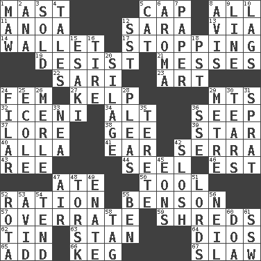 ACROSS 1. Vertical spar for supporting sails 5. Head covering 8. 100% 11. Small Philippine buffalo 12. "Two Mules for Sister ____" 13. By way of 14. Place for singles 17. Halting 19. Cease 21. Makes clutter 22. Indian skirt 23. Nonscientific branch of learning 24. Opposite of masc. 27. Seaweed 29. Mountains (abbr.) 32. Ancient Celtic tribe of eastern Britain 34. The first octave above the treble staff 36. Ooze 37. Old wives' tales, e.g. 38. Unit of force equal to gravity 39. Play the lead 40. Silent film actress Nazimova 41. Ewer handle 42. Spanish missionary in California 43. To separate or throw off 44. Stitch closed the eyes of (a falcon) 46. Eastern Standard Time (abbr.) 47. Had dinner 50. Implement 52. Food allowance for one day 55. Gillaume's butler role 57. Make much ado about nothing 59. Tears up 62. Shallow baking pan 63. Comedian Laurel of Laurel & Hardy 64. "Vaya con ____" 65. Find the sum of 66. Barrel 67. Cole _ (cabbage dish) DOWN 1. Opening into something insatiable 2. Santa ___, CA 3. Disposed of to a purchaser 4. Falsehoods 5. Feline 6. Odor 7. Some stationery 8. Opinion 9. Actor's bit 10. Fails to keep up a pace 12. Fast jet (abbr.) 15. 1973 Nobel Price Winner (Physics) Leo 16. Become fatigued 18. Pacific Standard Time (abbr.) 20. Fodder prepared in a silo 24. Having threads 25. Learning spot: Fr. 26. Haggard of country music 28. Entreaties 29. Distance measurement (Brit.) 30. Separates forcefully 31. Small fatty European fish 33. Teachers' org. 35. Cylindrical with tapered ends 36. Compass dir. 42. Splash clumsily 45. Immeasurably long periods of time 47. Atmosphere 48. Cod relative 49. Maternal 51. Domineers 52. Round or rotation of duties 53. Enthusiastic 54. Look after 55. Benjamin's nick name 56. Famous astronaut Armstrong 58. Label 60. ___ good deed 61. Compass dir.