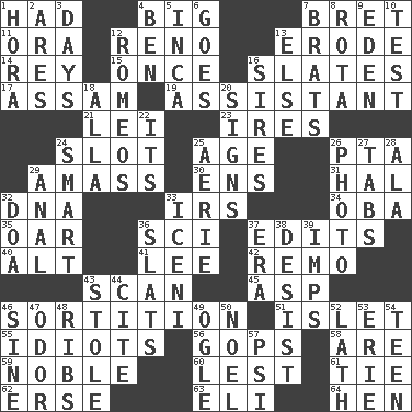 ACROSS 1. Possessed 4. Of large size 7. Cy Young winner Saberhagen 11. Mouth or opening 12. Former U.S. Attorney General Janet 13. Eat (away) 14. Marina Del _, California 15. Single time 16. Chalkboards 17. Indian state 19. Helper 21. Luau accessory 23. Angers 24. Narrow opening 25. Personal question 26. Parent Teacher Association (abbr.) 29. Collect or gather 30. Followers of ems 31. Actor Linden 32. Heredity factor (abbr.) 33. Big collection agency 34. Chief or king in Benin or Nigeria 35. Rowing implement 36. _-fi 37. Proofreads 40. Keyboard modifier key 41. Area sheltered from the wind 42. San ____ (Riviera town) 43. Glance over 45. Cleo's killer 46. Drawing lots 51. Small island 55. Foolish or stupid persons 56. Republicans 58. "We ___ not amused" (Victoria) 59. Having high moral qualities 60. For fear that 61. Neckwear 62. Celtic language 63. Biblical high priest 64. Layer DOWN 1. Israeli folk dance 2. Ancient Greek god of war 3. 24-hour periods 4. Benjamin's nick name 5. South American Indian 6. Moves 7. Naughty children 8. Roll call or roster of names 9. Genesis locale 10. Trial 12. Lover boys 13. Otherwise 16. Fathers 18. Silent film actress Nazimova 20. Signals 22. ___ a Wonderful Life 24. Don Adams' spy role 25. Nest on high 26. Picture 27. Bar bills 28. In the manner of 29. Of or related to the anus 32. ___ good deed 33. Ancient Celtic tribe of eastern Britain 36. Narrow boards 37. Period 38. Cease 39. Naughty children 43. Took without asking 44. Quote 46. Trig term 47. Aroma 48. Chest bones 49. Stare 50. Christmas carol 52. Thin strip of wood or metal 53. 4th largest of the Great Lakes 54. Adolescent 57. Air pressure measure (abbr.)