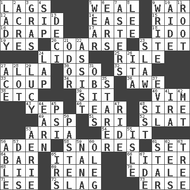 ACROSS 1. Falls behind 5. Welt 9. Armed conflict 12. Sour-tasting 14. Relaxation 15. River (Sp.) 16. Window treatment 17. Johnson of "Laugh-In" 18. Wedding promise 19. Affirmative reply 20. Unrefined 23. Proofreading order 24. Flaplike coverings 25. Cause heat under the collar 27. Silent film actress Nazimova 30. Bear (Spanish) 32. R.R. building 33. Overturn; upset 34. Teases 36. Deep reverence 38. And so on (abbr.) 39. Be seated 40. Zeal 43. Slangy assent 46. Separate forcefully 48. The founder of a family 49. Viper 51. Indian title of respect (Mr.) 52. Narrow board 53. Operatic vocal solo 54. Prepare for publication 56. Arabian gulf 58. Sounds asleep 61. Arrange properly for use 64. Soap unit 65. Slanted text style (abbr.) 66. 61 cubic inches 68. Cards in a Roman deck? 69. French philosopher Descartes 70. Peak District village in England 71. Compass dir. 72. Volcanic refuse 73. Celtic language DOWN 1. Kenny Rogers chart-topper in '80 2. Measure of real estate 3. Pate de foie ____ 4. Small drink 5. Put on (as clothing) 6. Hearing organs 7. Michaelmas daisies 8. Area sheltered from the wind 9. Compose 10. Assistant 11. Carrot, for example 13. Tenth: prefix 21. Aroma 22. Aid 23. Cole _ (cabbage dish) 24. Pet locale 26. Call ___ day 27. Adept person 28. Car dealer's back yard 29. "I Love _" 31. Off-Broadway awards 35. A viewer who gazes fixedly 37. Tending to cause great harm 41. Retirement account (abbr.) 42. Was introduced to 44. Merit 45. Air pressure measure (abbr.) 47. Travel on an animal 48. Fast jet (abbr.) 50. Soft color 53. Nest on high 55. Capri or Wight 56. Competent 57. Raised platform 59. Grandmother 60. Cassini of fashion 61. Play the lead 62. Snakelike fish 63. Family _ (genealogy) 65. Big collection agency 67. Binary compound