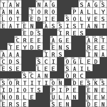 ACROSS 1. The 23rd letter of the Hebrew alphabet 4. Tired old horse 7. Droops 11. Santa ___, CA 12. "Corrida" creature 13. Chummy 14. Car dealer's back yard 15. Singer Brickell 16. Finds the solution 17. Consumed 19. Helper 21. Begley and Asner 23. Angers 24. Algonquian 25. Ripen 26. Nonscientific branch of learning 29. Miss Universe 1986, Barbara Palacios _ 30. Followers of ems 31. To separate or throw off 32. Auto club (abbr.) 33. Big collection agency 34. _ tizzy (2 wds.) 35. Music discs 36. _-fi 37. Stared at amorously 40. Compass dir. 41. Area sheltered from the wind 42. Travel by water 43. Examine minutely or intensely 45. The grampus (Milton) 46. Drawing lots 51. Writing tables 55. Foolish or stupid persons 56. Corncob 58. Compass dir. 59. Having high moral qualities 60. Uhlan (variant) 61. ___ Haven, CT 62. Celtic language 63. Elected rep. 64. Lair DOWN 1. Story 2. Small Philippine buffalo 3. Electrical Unit 4. Allow head to fall sleepily 5. Operatic vocal solo 6. Moves 7. Table seasonings 8. Inventor's middle name 9. Small, secluded valley 10. System (abbr.) 12. Watched over 13. Airs 16. Begets 18. Suggestive of the supernatural 20. Public displays of written messages 22. Perceive with the eye 24. Desist 25. Nest on high 26. Satellite of Uranus 27. Tear apart 28. Afternoon social gathering 29. Small boys 32. Adept person 33. Ancient Celtic tribe of eastern Britain 36. Narrow boards 37. Bear (Spanish) 38. Place where plants grow 39. Louse (plural) 43. Fur scarf 44. Quote 46. Trig term 47. Aroma 48. Teases 49. Musical composition 50. The longest river in the world 52. Transmit 53. Leg joint 54. Stitched 57. Baking dish