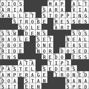 ACROSS 1. "Vaya con ____" 5. Atlas unit 8. The first octave above the treble staff 11. Operatic vocal solo 12. "Two Mules for Sister ____" 13. By way of 14. Place for singles 17. Halting 19. Disco prop 21. Makes clutter 22. Not divided or shared with others 23. Tate display 24. Compass dir. 27. Cub Scout units 29. Distress signal 32. White Person, in Hawaii 34. Put into a specified state 36. Be tempered by heat 37. Mitch Miller's instrument 38. Single 39. Relaxation 40. Travel on or in a vehicle 41. Not either 42. Administered medicine 43. Followers of ems 44. Do over again 46. Double-curved letter 47. _ moment's notice (2 wds.) 50. Native american tent (variation) 52. Soft color 55. Spring feasts 57. Electrical Measurement 59. Pressed 62. ___ good deed 63. Comedian Laurel of Laurel & Hardy 64. Nanny 65. Be seated 66. Car or cant ending 67. Hurried DOWN 1. Simpleton 2. Lyricist Gershwin 3. Lubricates 4. Table seasonings 5. Floor protector 6. Scent 7. Some stationery 8. Advice 9. Actor's bit 10. Labels 12. Compass dir. 15. Eat (away) 16. Lacquered or enameled metalware 18. Pacific Standard Time (abbr.) 20. Gillaume's butler role 24. Dinah or Pauly 25. Unit of acoustic absorption 26. Forest 28. Sir (Sp.) 29. Gospel singer Marvin 30. Fertile tracts in a desert 31. Bobsleighs 33. Area sheltered from the wind 35. Cigar-shaped 36. Modern: prefix 42. Drug addict 45. "You Light Up My Life" star Conn 47. Had dinner 48. Laconic 49. Having winglike extensions 51. Removes the wrinkles 52. Writing tablets 53. Mine, in Marseilles 54. Petty quarrel 55. Elected rep. 56. Fastener 58. Separate the seeds from cotton 60. Compass dir. 61. Male parent