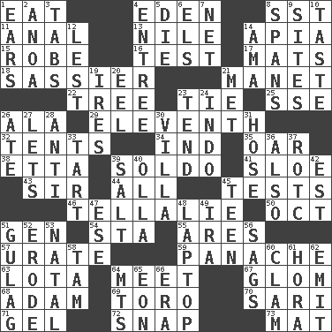 ACROSS 1. Erode 4. Genesis locale 8. Fast jet (abbr.) 11. Of or related to the anus 13. Mediterranean tributary 14. Capital of Western Samoa 15. Loose flowing garment 16. Trial 17. Floor coverings 18. More lively and spirited 21. French painter Edouard 22. Woody plant 23. Neckwear 25. Compass dir. 26. According to 29. Veterans Day date 32. Portable shelters 34. Working for oneself (abbr.) 35. Boat paddle 38. Singer James 39. Twentieth part of a lira 41. A type of plum 43. Title for a knight 44. Everything 45. Trials 46. Copy Pinocchio 50. Sep. follower 51. Commissioned military rank (abbr.) 54. R.R. building 55. Ancient Greek god of war 57. A salt of uric acid 59. Flamboyance 63. Globular water bottle used in Asia 64. Rendezvous 67. Seize upon or latch onto something 68. First man 69. "Corrida" creature 70. Indian skirt 71. Set 72. Fastener 73. Floor protector DOWN 1. Hearing organs 2. Small Philippine buffalo 3. Bar bills 4. Main course 5. Expire 6. Raised railways 7. Remaining after all deductions 8. Connects, as a bridge 9. Locates 10. Clothes sense 12. For fear that 14. Housemaid (var.) 19. Angers 20. Snakelike fish 21. Was introduced to 23. Look after 24. _ china 26. Had dinner 27. Allows 28. Against 30. Country residence 31. Flexible conduit 33. Small pie 36. In addition 37. College mil. group 39. Table seasoning 40. Spanish pot 42. Eastern Standard Time (abbr.) 45. Adolescent 47. Compass dir. 48. Portable computer 49. Retirement account (abbr.) 51. POW camp 52. Wear away 53. Relating to or accompanying birth 56. Settles 58. Scottish cap 60. Burrowing marine mollusk 61. Israeli folk dance 62. Give off 64. Mountains (abbr.) 65. A really long time 66. Epoch