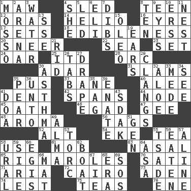 ACROSS 1. Opening into something insatiable 4. Downhill vehicle 8. Adolescent 12. Mouths or openings 14. Sun: prefix 16. Jane of fiction 17. Puts into a specified state 18. The property of being fit to eat 20. Scornful expression 22. Ocean 23. Arrange properly for use 24. Boat paddle 25. It would 28. The grampus (Milton) 30. The sixth month of the Jewish calendar 31. Shuts with force 35. Fluid product of inflammation 37. Object of repulsion 40. Toward shelter 41. Undesirable depression on a surface 42. Connects, as a bridge 44. Connecting point 45. Pledge 46. Mild oath 47. Turn to the right 48. Scent 50. Labels 52. The first octave above the treble staff 54. Supplement with great effort 55. Afternoon social gathering 58. Purpose 61. Crowd into 63. Rhinal 65. Frustrating wastes of time 70. Suttee (variant) 71. Operatic vocal solo 72. Capital of Egypt 73. Arabian gulf 74. For fear that 75. Beverages made from leaves 76. Compass dir. DOWN 1. With motion or animation 2. Sports stadium 3. Wetness 4. A female animal or person 5. Directed 6. Biblical high priest 7. Rights 8. Nine, plus one 9. Sight organs 10. Celtic language 11. Egg locale 13. Compass dir. 15. Margarine 19. Hearing organs 21. To free from 26. Bar bills 27. Window treatment 29. Rings like a ship's bell 30. Respiratory problem 32. _ vera 33. Ancient Persian 34. Observe 35. Lightbulb-shaped fruit 36. To (old English) 38. Tired old horse 39. Maternal 41. ___ good deed 43. Neighbor of Neb. 49. _ mater 51. Commissioned military rank (abbr.) 53. Torque (variant) 55. Sadhe (variant) 56. Eroded 57. Place in a line 58. Mountain range 59. Beget 60. The front part of a cuirass 62. Water vessel 64. White ___ sheet 66. Floor protector 67. Whopper 68. Epoch 69. Distress signal