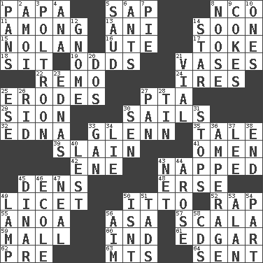 ACROSS 1. Dad 5. Plant excrement 8. Non-commissioned officer (abbr.) 11. Amid 13. Black tropical American cuckoo 14. Within a short period 15. Pitcher Ryan 16. Shoshoni 17. Casino tip 18. Be seated 19. Probability 21. Flower holders 22. San ____ (Riviera town) 24. Angers 25. Eats (away) 27. Parent Teacher Assoc. 29. The Jewish people; Israel 30. Travels by water 32. Pulitzer Prize-winning author Ferber 33. American astronaut and politician John 35. Story 39. Killed 41. Presage 42. Compass dir. 43. Slept 45. Lairs 48. Celtic language 49. It is permitted: Lat. 50. "Tell ____ the Marines!" 52. Hit sharply and swiftly 55. Small Philippine buffalo 56. White ___ sheet 57. Any of the three canals of the cochlea 59. Promenade 60. Indiana (abbr.) 61. _ Allan Poe 62. Before (prefix) 63. Mountains (abbr.) 64. Emitted DOWN 1. Zero-star reviews 2. Mine, in Marseilles 3. Characterized by complete cowardliness 4. Santa ___, CA 5. Saudi Arabian king (1953-1964) 6. Pismires 7. Sliced dessert 8. Trap for birds or small mammals 9. Popular sodas 10. Singles 12. Dwarf 14. Play the lead 20. Two (Sp.) 21. Small bottle 23. Ferber et al. 25. Compass dir. 26. To free from 27. Baking dish 28. Metal container 30. Elected rep. 31. Ceases 33. Separate the seeds from cotton 34. Falsehood 36. Electrical Measurement 37. Area sheltered from the wind 38. Conclude 40. For fear that 43. Remaining after all deductions 44. Came up 45. Middle Eastern gold or silver currency 46. Learning spot: Fr. 47. Anneal 49. Desk light 50. Is not 51. Small amounts or degrees 53. Actor Alda or Thicke 54. Piece 56. Direct toward a target or goal 58. Music discs