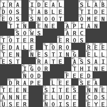 ACROSS 1. Retirement account (abbr.) 4. Perfect 9. Broad, flat, thick piece 13. Two (Sp.) 14. Eating place 15. Event that recurs at intervals 16. Greek goddess of the dawn 17. Snob 18. Sign of things to come 19. Shallow baking pan 21. Compass dir. 22. Bee-related 24. Sty mamas 26. Curve 27. Carrier 29. Greek god of love 30. Peak District village in England 31. "Corrida" creature 33. To sift 36. Nine, plus one 37. Inhabiting a nest 40. Pipe bend 41. Eastern Standard Time (abbr.) 42. Assign a rank or rating to 43. Slender Brazilian palm 45. Russian composer Stravinsky 47. One or ones belonging to thee 48. Lower and raise head in agreement 49. Nourish 50. Window treatment 52. Area sheltered from the wind 54. Ocean 56. Adolescent 57. Locates 59. Compass dir. 61. Queen of England 1702-14 62. Dodge 63. Music discs 64. One who makes use of a thing 65. Annoying sound 66. Sight organ DOWN 1. Binary compound 2. Carrot, for example 3. Aide 4. ___ a Wonderful Life 5. Natives or inhabitants of Denmark 6. Inky black, to poets 7. _ vera 8. Allow 9. Unemotional ones 10. Pale green bean 11. Arabian gulf 12. Benjamin's nick name 20. Christmas carol 22. Composer Copland 23. Adept person 25. Songbird 27. Wig 28. Lyric poems 29. One of the Great Lakes 31. Russian ruler of old 32. Baseball player Mel 33. Dwelling 34. Enthusiasm 35. Writer Wiesel 38. Wear away 39. Yard entry 44. "______ My Girl" (Turtles hit) 45. More empty; more void 46. Republican Party 49. Eats 50. Lairs 51. French philosopher Descartes 52. _ and Stitch 53. Needle case 55. Actor Griffith 56. The 19th letter of the Greek alphabet 57. Elected rep. 58. Observe 60. Compass dir.
