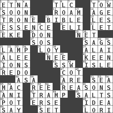 ACROSS 1. Inactive volcano in Sicily 5. Affectionate concern, for short 8. Pull behind 11. Within a short period 12. Wander aimlessly 14. Personal question 15. Heavy duty weighing machine 17. The Good Book 18. French article 19. Core 21. Connecticut Ivy Leaguer 22. Allow 23. Make supply last 24. Spanish title 25. Remaining after all deductions 27. Mayday 28. Sinks 31. Desk light 35. Myrna of the movies 37. Mountain range southwest of Kyrgyzstan 38. Toward shelter 39. Born 41. Peachy ____! 42. Charged particles 43. Compass dir. 45. Capri or Wight 46. Do over again 47. Small bed 49. White ___ sheet 51. "We ___ not amused" (Victoria) 52. Ocean 55. Apple computer (short form) 57. To riddle 60. Thinks logically 62. Cuckoo 63. _____ steamer (cargo ship) 65. Table seasonings 66. Plant holder 67. Celtic language 68. It may be bright or harebrained 69. Declare 70. Arrange properly for use 71. Australian parrot (variant) DOWN 1. First name in cosmetics 2. Cod relative 3. Trap for birds or small mammals 4. Singer Murray 5. Three (prefix) 6. Ear part 7. Give a ring to 8. Baron Munchausen's specialties 9. Double curve, resembling the letter S 10. 270 degrees 13. Chow _ 16. Extremities 17. Gillaume's butler role 20. Calm and collected 26. 1973 Nobel Price Winner (Physics) Leo 29. Highlander 30. Trig term 31. Den 32. _ vera 33. Ananias' fault 34. Mexican monetary units 36. Consenting reply 40. Fortification 44. Had on 48. Afternoon social gatherings 50. Johnson of "Laugh-In" 52. Twentieth part of a lira 53. Keyboard key 54. Slender Brazilian palm 55. Atlas contents 56. Small Philippine buffalo 58. Blunders 59. Relaxation 61. Move on water 64. Was introduced to