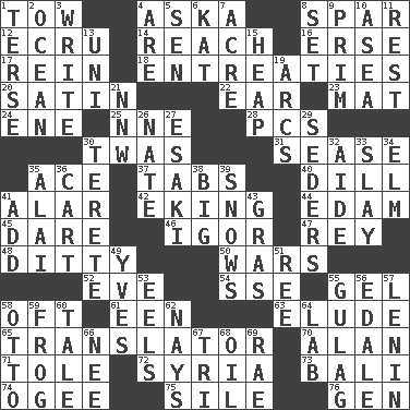 ACROSS 1. Pull behind 4. "____ silly question..." 8. Practice fight 12. Shade of tan 14. Arrive at 16. Celtic language 17. It's straight from the horse's mouth 18. Pleas 20. Smooth fabric 22. Ewer handle 23. Floor covering 24. Compass dir. 25. Compass dir. 28. Personal Computers (abbr.) 30. It was, poetically 31. Gospel singer Marvin 35. Adept person 37. Bar bills 40. Deli pickle 41. Having or resembling wings 42. Supplementing with great effort 44. Dutch treat 45. Have the gumption 46. Composer Stravinsky 47. Marina Del _, California 48. Short, simple song 50. Armed conflicts 52. Night before a holiday 54. Compass dir. 55. Set 58. Often (poetically) 61. Car or cant ending 63. Evade 65. Interpreter 70. Actor Alda or Thicke 71. Lacquered or enameled metalware 72. Damascus' land 73. Indonesian resort city 74. Double curve, resembling the letter S 75. Filth; sediment 76. Commissioned mil. rank DOWN 1. Laconic 2. Sea 3. Compose 4. "We ___ not amused" (Victoria) 5. Elected rep. 6. Krazy ___ of comics 7. 1/640 square mile 8. Put into a specified state 9. Demure 10. At sea 11. State of inaction 13. Single; one (prefix) 15. Pile 19. Arches 21. Compass dir. 26. Nathan's nickname 27. 1973 Nobel Price Winner (Physics) Leo 29. Spring feasts 30. Cigar-shaped 32. Assistant 33. Kill 34. Shade tree 35. Jai _ 36. Draw slowly or heavily 38. Massive 39. Frozen precipitation (plural) 41. Increase 43. Pate de foie ____ 49. Jacques Cousteau's middle name 51. To separate or throw off 53. Snakelike fish 55. POW camp 56. Peak District village in England 57. Soviet premier 1918-24 58. "Beetle Bailey" pooch 59. Toadlike animal 60. Story 62. Negative votes 64. Experiment locale 66. Born 67. Three (prefix) 68. Petroleum 69. Actress Charlotte