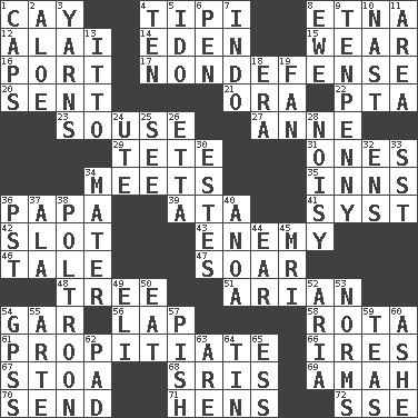 ACROSS 1. Island 4. Native american tent (variation) 8. Inactive volcano in Sicily 12. Jai _ 14. Locale of original sin 15. Put on (as clothing) 16. Sweet dark-red dessert wine 17. Unrelated to defense, as in spending 20. Posted 21. Mouth or opening 22. Parent Teacher Assoc. 23. Boozer 27. Singer Murray 29. Wig 31. Washington bills 34. Confronts 35. Restaurants 36. Dad 39. _ moment's notice (2 wds.) 41. System (abbr.) 42. Narrow opening 43. Foe 46. Lie 47. Fly high 48. Woody plant 51. Believer in; advocate of (suffix) 54. Slender fish 56. Pet locale 58. Roll call or roster of names 61. Appease 66. Angers 67. Portico 68. Indian titles of respect 69. Nursemaid 70. Post 71. Coop moms 72. Compass dir. DOWN 1. Smile enhancers 2. _ vera 3. Tall tales 4. Nine, plus one 5. Wedding promise 6. Fenced enclosure 7. Southeast Asian peninsula 8. She-sheep 9. 3-inch nail 10. Political cartoonist Thomas 11. Length times width 13. "Tell ____ the Marines!" 18. Period 19. Avid follower 24. Shoshoni 25. Perceive with the eye 26. Singer James 28. Annoyingly loud 30. _____ Park, CO 32. Followers of ems 33. Fast jet (abbr.) 34. Mother 36. Pacific Standard Time (abbr.) 37. Chicken ___ king 38. Coward 40. Small Philippine buffalo 44. Hearing organ 45. Medical imaging device (abbr.) 49. Biblical high priest 50. Ingest 52. Operatic vocal solo 53. Typical standards 54. Global Positioning Systems (abbr.) 55. Johnson of "Laugh-In" 57. Expression of disdain 59. Beverages made from leaves 60. American tennis player Robert 62. Groovy apt. 63. "We ___ not amused" (Victoria) 64. Metal container 65. Double-curved letter
