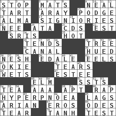 ACROSS 1. Obstruct or block passage 5. Floor coverings 9. Anneal 13. Small pie 14. Like ___ of sunshine 15. Plash 16. _ mater 17. Seigniories (variant) 19. Born 20. "One Day ___ Time" 21. Music discs 22. Eastern Standard Time (abbr.) 23. Indian titles of respect 25. Being at a high temperature 26. Looks after 30. Family _ (genealogy) 34. Lessep's creation 35. Became colored 36. Soft 39. Peak District village in England 42. Snakelike fish 43. Migrant worker of the '30s 44. Separates forcefully 46. Moistens 47. First name in cosmetics 48. Shade tree 51. Fast planes 54. Beverage made from leaves 57. American Automobile Association (abbr.) 58. Fitting 60. Reproach for some lapse or misdeed 62. Abnormally rapid or deep breathing 65. Fails to keep up a pace 66. Believer in; advocate of (suffix) 67. Greek god of love 68. Lyric poems 69. Lacerate 70. Hyperbolic tangent 71. Trial DOWN 1. Comedian Laurel of Laurel & Hardy 2. Stories 3. Channel Islands abalone 4. Parent Teacher Assoc. 5. Vertical spar for supporting sails 6. Roberta Peters solo 7. Label 8. Synchronize (abbr.) 9. Not either 10. Singer Brickell 11. Ripens 12. For fear that 15. Mail 18. Wedding promise 20. At sea 24. Skin irritations 27. Compass dir. 28. Male parent 29. Schedule 30. College papers 31. Sorrow 32. Snakelike fish 33. Begley and Asner 36. Immediately 37. Make supply last 38. Be seated 40. French article 41. Erode 45. Remainder 48. Merit 49. Pet locale 50. French painter Edouard 52. Barter 53. Gurus 54. Not this but _ 55. Jane of fiction 56. Capital of Western Samoa 58. A really long time 59. Romantic infatuation 61. Inconspicuous attention getter 63. Hearing organ 64. Mouth or opening 65. Car dealer's back yard