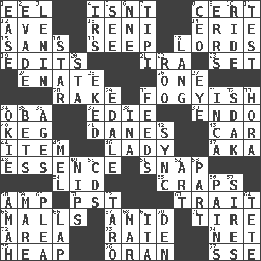 ACROSS 1. Snakelike fish 4. Is not 8. Sure thing 12. "___ Maria" 13. Painter Guido (1575-1642) 14. One of the Great Lakes 15. Without 17. Ooze 18. Nobles 19. Proofreads 21. Retirement account (abbr.) 23. Arrange properly for use 24. Related on the mother's side 26. Single 28. Immoral or dissolute person 30. Out of fashion; old fashioned 34. Chief or king in Benin or Nigeria 37. Singer Brickell 39. Inside; within (prefix) 40. Cask 41. Natives or inhabitants of Denmark 43. 4-wheeled motor vehicle 44. A distinct part 46. Kenny Rogers chart-topper in '80 47. Alias (abbr.) 48. Center 51. Fastener 54. Flaplike covering 55. Dice game 58. Electrical Unit 61. Pacific Standard Time (abbr.) 63. Distinguishing feature 65. Promenades 67. Among 71. Become fatigued 72. Length times width 73. Assign a rank or rating to 74. Remaining after all deductions 75. Pile 76. NW Algerian seaport 77. Compass dir. DOWN 1. Comfort 2. Dodge 3. Soviet premier 1918-24 4. Big collection agency 5. Perceive with the eye 6. Compass dir. 7. Native american tent (variation) 8. Corporate head (abbr.) 9. Blunders 10. Travel on or in a vehicle 11. Trial 16. Play the lead 18. Long (Scottish) 20. R.R. building 22. Friend of Pooh 25. Made supply last 27. Sight organ 29. Peak District village in England 30. Eats 31. South American Indian 32. Neighbor of Neb. 33. Israeli folk dance 34. Migrant worker of the '30s 35. Stakes 36. Grows older 38. _ tizzy (2 wds.) 42. Synchronize (abbr.) 45. Cartoonist voice _ Blanc 49. Cuts off 50. Music discs 52. Tate display 53. Component 56. Aches 57. Begets 58. Nursemaid 59. Female horse 60. Entreaty 62. Pacific island yam 64. False hair 66. Infant locale 68. Third mo. 69. Call ___ day 70. Lair