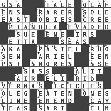 ACROSS 1. Girls' org. (abbr.) 4. Lie 8. Norwegian king 12. Followers of ems 13. More uncommon 14. Flatfish 15. Compass direction 17. Off-Broadway awards 18. Algonquian 19. Player piano 21. Dodged 23. Institute legal proceedings 24. Compass dir. 26. Big collection agency 27. Singer James 28. Oceans 30. Alias (abbr.) 31. Soft color 34. 17th letter of the Greek alphabet 37. Elected rep. 38. Satellite of Uranus 39. Car or cant ending 40. Pacific Standard Time (abbr.) 41. Sounds asleep 42. Compass dir. 43. Backtalk 44. Set down 46. Wind 47. Biblical high priest 50. To free from 51. Actresses Bloom and Felton 54. Winter's stalactites 57. Cassini of fashion 58. Ingested 60. Singles 62. Actor's bit 63. Make improvements or corrections to 64. Island 65. Afternoon social gatherings 66. Indian skirt 67. Shade tree DOWN 1. Turn to the right 2. Fastener 3. Helper 4. Eating place 5. Believer in; advocate of (suffix) 6. Area sheltered from the wind 7. Celtic language 8. Motion picture awards 9. Titled peers of a realm 10. Toward shelter 11. Nourish 13. Friend of Pooh 16. Strained 20. Teachers' org. 22. Small bottle 25. First name in cosmetics 27. Supplements with great effort 29. Snakelike fish 30. Cleo's killer 31. Zero-star reviews 32. Came up 33. Title for a knight 34. Dwelling 35. Command 36. Single 41. "Two Mules for Sister ____" 43. Burns superficially 44. Curve 45. _ and Stitch 46. Sports stadium 48. 61 cubic inches 49. Ancient Celtic tribe of eastern Britain 51. Electrical Unit 52. Writer Wiesel 53. Observes 55. Indiana (abbr.) 56. Lick closed 59. Housemaid (var.) 61. Symbol (abbr.)