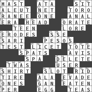 ACROSS 1. Vertical spar for supporting sails 5. "One Day ___ Time" 8. Be seated 11. Native American of Southwest Alaska 13. Remaining after all deductions 14. "Corrida" creature 15. Indian princess (variant) 16. Single 17. Of or related to the anus 18. Period 19. Froth on beer 21. Speak pompously 22. Adolescent 24. Old wives' tales, e.g. 25. Eats (away) 27. Compass dir. 29. Indian skirt 30. Mexican monetary units 32. Trial 33. It is permitted: Lat. 35. Lug 39. Arguments over trivial matters 41. Opinion 42. Health resort 43. Erase 45. It was, poetically 48. One who uses or employs something 49. Upper-body garment 50. Position in a hierarchy or organization 52. To free from 55. Hoop that covers a wheel 56. Chicken ___ king 57. Elude 59. Washington bills 60. Separate the seeds from cotton 61. Eroded 62. For each 63. Oval reproductive body of a fowl 64. Afternoon social gatherings DOWN 1. Female horse 2. Having or resembling wings 3. Legislators 4. Third day of the wk. 5. Small Philippine buffalo 6. Be inclined (to) 7. Had dinner 8. Underwater navigation system 9. Feeling or showing extreme anger 10. Lacquered or enameled metalware 12. Giggle 14. Pacific island yam 20. Followers of ems 21. Margarine 23. Prepares for publication 25. Eastern Standard Time (abbr.) 26. Actress Charlotte 27. Perceive with the eye 28. Fast jet (abbr.) 30. Personal Computers (abbr.) 31. Lacking originality or spontaneity 33. Pet locale 34. Call ___ day 36. Make much ado about nothing 37. Teat (slang) 38. Compass dir. 40. Inconspicuous attention getter 43. Superhero pair 44. First name in cosmetics 45. One or ones belonging to thee 46. One who wires 47. Ancient Greek god of war 49. Cease 50. Volcanic refuse 51. Long (Scottish) 53. It may be bright or harebrained 54. Cub Scout units 56. Ripen 58. Large container