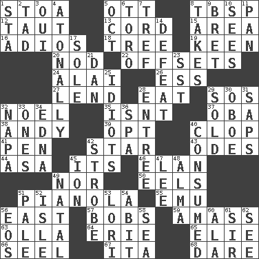 ACROSS 1. Portico 5. Baseball player Mel 8. Cook's measure (abbr.) 12. Drawn tight 13. Drawstring 15. Length times width 16. Goodbye (Sp.) 18. Woody plant 19. Peachy ____! 20. Allow head to fall sleepily 22. Cancels 24. Jai _ 26. Curvy letter 27. Grant temporary use of 28. Consume 29. Mayday 32. Christmas carol 35. Is not 37. Chief or king in Benin or Nigeria 38. Actor Griffith 39. Elect 40. Hoof sound 41. Animal enclosure 42. Play the lead 43. Lyric poems 44. White ___ sheet 45. ___ a Wonderful Life 46. Enthusiasm 49. Not either 50. Snakelike fish 51. Player piano 55. Australian flightless bird 56. 90 degrees 57. Moves up and down 59. Collect or gather 63. Rounded earthenware pot or jar 64. 4th largest of the Great Lakes 65. Writer Wiesel 66. Stitch closed the eyes of (a falcon) 67. Call ___ day 68. Have the gumption DOWN 1. R.R. building 2. Small boy 3. Fr. "Yes" 4. Lacking a tonal center or key 5. Sep. follower 6. "Corrida" creature 7. Not kosher 8. Receives possession of 9. Cy Young winner Saberhagen 10. Observes 11. Baking dish 14. Outscore 17. Flatfish 21. Daniel's nick name 23. Fast jet (abbr.) 25. Foolish or stupid persons 28. Main course 29. Disposed of to a purchaser 30. Mitch Miller's instrument 31. Plant excrements 32. California wine valley 33. Singles 34. Pulitzer Prize-winning author Ferber 36. Health resort 40. Ingested 42. Disco prop 45. Electrically charged atom 47. Area sheltered from the wind 48. _ mater 49. Relating to or accompanying birth 51. Light colored 52. Capri or Wight 53. Australian parrot (variant) 54. "This won't hurt ____!" 56. Greek goddess of the dawn 58. Ocean 60. Wing 61. Title for a knight 62. Perceive with the eye