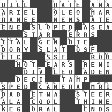 ACROSS 1. Deli pickle 5. Pace 9. Santa ___, CA 12. Satellite of Uranus 14. Butter sub 15. Third mo. 16. Indian princess (variant) 17. Not women's 18. Had dinner 19. Compass dir. 20. Inclined 23. Toward the sea 24. Play the lead 25. Blunders 27. Slanted text style (abbr.) 30. Commissioned military rank (abbr.) 32. Expire 33. Small, narrow, flatbottom fishing boat 34. Narrow board 36. Order of Saint Francis (abbr.) 38. And so on (abbr.) 39. Compass dir. 40. Director Reiner 43. Being at a high temperature 46. Hearing organs 48. Painter Guido (1575-1642) 49. HTML Container Element 51. Lion 52. Arabian gulf 53. Tenth: prefix 54. Pack (down) 56. Drove too fast 58. Device for capturing images 61. Medical imaging device (abbr.) 64. Pat or tap gently 65. Inactive volcano in Sicily 66. Navigate 68. In the manner of 69. Calm and collected 70. One or ones belonging to thee 71. Barrel 72. Of the mouth 73. Extremities DOWN 1. Have the gumption 2. SW Asia republic 3. Actor's bit 4. Area sheltered from the wind 5. Frolic 6. Toward shelter 7. Watched over 8. Greek goddess of the dawn 9. Collect or gather 10. Nathan's nickname 11. Type of rug 13. For fear that 21. Falls behind 22. Threatening words 23. Ancient Greek god of war 24. Roguish 26. _ de Janeiro 27. Binary compound 28. Small child 29. Bowlike part 31. Relating to the nose 35. Cigar-shaped 37. Flintstone 41. Single 42. Storage container 44. Wrote a lyric poem 45. Nervous spasm 47. Fly high 48. Strike 50. Winning man's name 53. Debunk (Brit. slang) 55. Vertical spar for supporting sails 56. Neighbor of Neb. 57. Light colored 59. Small Philippine buffalo 60. Promenade 61. Chow _ 62. Tear apart 63. Angers 65. Environmental prefix 67. Definite Article