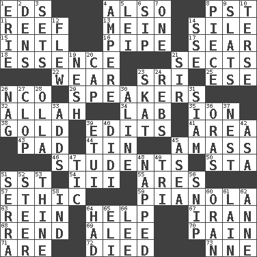 ACROSS 1. Begley and Asner 4. In addition 8. Pacific Standard Time (abbr.) 11. Coral ridge 13. Chow _ 14. Filth; sediment 15. International (abbr.) 16. Corncob 17. Burn superficially 18. Substance 21. Religious groups 22. Put on (as clothing) 23. Indian title of respect (Mr.) 25. Compass dir. 26. Non-commissioned officer (abbr.) 29. Orators 32. Assad's deity 34. Experiment locale 35. Electrically charged atom 38. Gilded 39. Prepares for publication 41. Length times width 43. Groovy apt. 44. Metal container 45. Collect or gather 46. SAT takers 50. R.R. building 51. Fast jet (abbr.) 54. One more than two 55. Ancient Greek god of war 57. Principle of right and wrong 59. Player piano 63. It's straight from the horse's mouth 64. Assist 67. SW Asia republic 68. Tear apart 69. Toward shelter 70. Ache 71. "We ___ not amused" (Victoria) 72. Passed on 73. Compass dir. DOWN 1. One of the Great Lakes 2. Habitations of wild animals 3. Puts into a specified state 4. Electrical Unit 5. Luau accessory 6. Small drink 7. Single 8. Part 9. Narrow boards 10. Laconic 12. Soared 14. Compass dir. 19. Delicate 20. Head covering 21. Title for a knight 23. Three-handed card game 24. Confederate soldiers (slang) 26. Tired old horse 27. Hoof sound 28. Rounded earthenware pot or jar 30. Place in a line 31. Thailand, formerly 33. Does sums 36. Mouths or openings 37. A home for chicks 39. Needle case 40. "You Light Up My Life" star Conn 42. White ___ sheet 45. At sea 47. Nervous spasm 48. Slept 49. Three (prefix) 51. Father Junipero _ 52. Guide 53. One or ones belonging to thee 56. Sever or remove by pinching or nipping 58. Working for oneself (abbr.) 60. Northwest Algerian city 61. (Had) reclined 62. Singer Murray 64. Possessed 65. Biblical high priest 66. Area sheltered from the wind