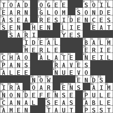 ACROSS 1. Frog relative 5. Double curve, resembling the letter S 9. Earth 13. Merit 14. Seize upon or latch onto something 15. Message 16. At sea 17. Homes 19. Elected rep. 20. Layer 21. Whopper 22. Ingest 23. Indian skirt 25. Affirmative reply 26. Standard of perfection 30. Lip ointment 34. Haggard of country music 35. 4th largest of the Great Lakes 36. US Secretary of Labor Elaine L. _ 39. Having winglike extensions 42. Famous astronaut Armstrong 43. Zero-star reviews 44. All-night dance parties 46. Toward shelter 47. New (sp.) 48. At this time 51. Conclusions 54. Retirement account (abbr.) 57. Boat paddle 58. Followers of ems 60. Direct toward a target or goal 62. Unrelated to defense, as in spending 65. Whine 66. Lessep's creation 67. Oceans 68. Competent 69. So be it 70. Tense 71. Inconspicuous attention getter DOWN 1. Beverages made from leaves 2. Fertile tracts in a desert 3. Sports stadium 4. Heredity factor (abbr.) 5. Legendary monster 6. Small, secluded valley 7. Greek goddess of the dawn 8. Poet Dickinson 9. Boy, to dad 10. At one time in the past 11. It may be bright or harebrained 12. For fear that 15. Observes 18. Pass on 20. Flintstone garb 24. Full of chinks, cracks, or crevices 27. Epoch 28. 100% 29. Acquire or gain knowledge or skills 30. Gillaume's butler role 31. "We ___ not amused" (Victoria) 32. Cards in a Roman deck? 33. Cartoonist voice _ Blanc 36. Numbers guy (abbr.) 37. Actor Linden 38. A saturated hydrocarbon 40. The 19th letter of the Greek alphabet 41. First lady 45. Nights before holidays 48. Christmas carol 49. Clumsy lout 50. Take or capture by force 52. Applies to a surface 53. Beverly of Met fame 54. South American Indian 55. Wander aimlessly 56. Queen of England 1702-14 58. Son of Isaac 59. Egg locale 61. Rendezvous 63. Daniel's nick name 64. Teachers' org. 65. Infant food