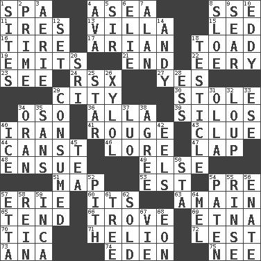 ACROSS 1. Health resort 4. At sea 8. Compass dir. 11. Angers 13. Country residence 15. Directed 16. Hoop that covers a wheel 17. Believer in; advocate of (suffix) 18. Frog relative 19. Gives off 21. Conclusion 22. Suggestive of the supernatural 23. Observe 24. Acura sports coupe 27. It is so 29. Municipality 30. Took without asking 34. Bear (Spanish) 36. Silent film actress Nazimova 39. Grain storage towers 40. SW Asia republic 41. Makeup applied to the cheeks 43. A slight indication 44. 2nd pers. sing. pres. of can (arch.) 46. Old wives' tales, e.g. 47. Infant locale 48. Follow as a consequence or result 49. Otherwise 51. Atlas unit 53. Eastern Standard Time (abbr.) 54. Before (prefix) 57. 4th largest of the Great Lakes 60. ___ a Wonderful Life 63. With great haste 65. Watch over 66. Collection of objects 69. Inactive volcano in Sicily 70. Nervous spasm 71. Sun: prefix 72. For fear that 73. Santa ___, CA 74. Paradise 75. Born DOWN 1. Settings 2. First class 3. Nest on high 4. Actress Gardner 5. Title for a knight 6. Writer Wiesel 7. Actor Alda or Thicke 8. A type of plum 9. Wither 10. Whirlpool 12. Put into a specified state 14. Actor Griffith 18. A testis 20. _ Lanka 25. Play the lead 26. Xylene (variant) 28. Curvy letter 29. Eaten 31. Water jar 32. Central Nebraska county 33. Compass dir. 34. NW Algerian seaport 35. Without 37. Nilotic language 38. Match 40. Frozen water 42. Snakelike fish 45. Afternoon social gathering 50. R.R. building 52. Essential or central part 54. Eucharist need 55. Wash lightly 56. Maternal 57. Singer James 58. It's straight from the horse's mouth 59. South American Indian 61. Relationship diagram 62. Exchanged or delivered for money 64. Cartoonist voice _ Blanc 67. Compete 68. A really long time