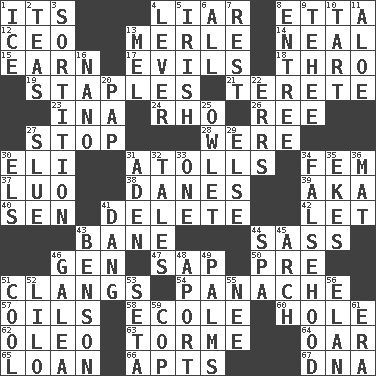 ACROSS 1. It is 4. One who doesn't tell the truth 8. Singer James 12. Corporate head (abbr.) 13. Haggard of country music 14. Be tempered by heat 15. Merit 17. Vices 18. Through, poetically 19. Paper fasteners 21. Cylindrical with tapered ends 23. _ tizzy (2 wds.) 24. 17th letter of the Greek alphabet 26. To riddle 27. Constrict 28. Past tense of be (plural) 30. Connecticut Ivy Leaguer 31. Ringlike coral islands and reefs 34. Opposite of masc. 37. Nilotic language 38. Natives or inhabitants of Denmark 39. Alias (abbr.) 40. Elected rep. 41. Erase 42. Allow 43. Object of repulsion 44. Backtalk 46. Commissioned mil. rank 47. Plant excrement 50. Before (prefix) 51. Rings like a ship's bell 54. Flamboyance 57. Petroleums 58. Learning spot: Fr. 60. Opening into or through something 62. Margarine 63. Singer Mel 64. Rowing implement 65. Grant temporary use of 66. Flats, for short 67. Heredity factor (abbr.) DOWN 1. Frozen water 2. Beverages made from leaves 3. Determination 4. Prying instrument 5. From or relating to Ireland 6. Everything 7. Respite 8. Main course 9. Giggle 10. Small pie 11. Medicinal plant 13. Cartoonist voice _ Blanc 16. Billionth: prefix 20. Infant food 22. Blunders 25. A small or young owl 27. Turn sharply 29. Otherwise 30. Raised railways 31. An important port of Yemen 32. Lies 33. Single 34. It jiggles the polygraph 35. Supplements with great effort 36. Floor protector 41. Mild oath, euphamism for damn 43. Gillaume's butler role 44. Health resort 45. Bowlike part 46. An organ shaped like a helmet 48. To the left, to Queeg 49. Insides of hands 51. Calm and collected 52. _ and Stitch 53. Stalk of a moss capsule 55. Born 56. Enthusiasm 59. Police officer (slang) 61. Period