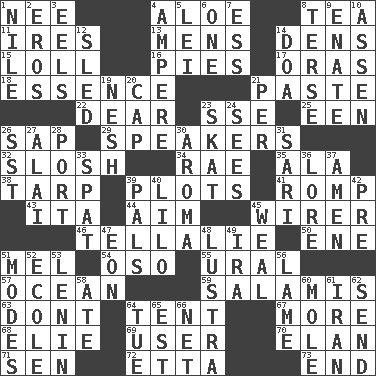 ACROSS 1. Born 4. Medicinal plant 8. Beverage made from leaves 11. Angers 13. Not women's 14. Hiding places for outlaws 15. Hang loosely or laxly 16. Sliced desserts 17. Mouths or openings 18. Substance 21. Thick mixture 22. Letter starter 23. Compass dir. 25. Car or cant ending 26. Plant excrement 29. Orators 32. Splash clumsily 34. Actress Charlotte 35. In the manner of 38. Canvas cover 39. Small pieces of grounds 41. Frolic 43. Call ___ day 44. Direct toward a target or goal 45. One who wires 46. Copy Pinocchio 50. Compass dir. 51. Cartoonist voice _ Blanc 54. Bear (Spanish) 55. Mountain range 57. Sea 59. Deli grouping 63. Do not 64. Portable shelter 67. Greater amount 68. Writer Wiesel 69. One who uses or employs something 70. Liveliness 71. Elected rep. 72. Singer James 73. Conclude DOWN 1. Mediterranean tributary 2. Greek god of love 3. Snakelike fish 4. Electrical Unit 5. Flowery wreath 6. Single 7. Curvy letter 8. Laconic 9. Related on the mother's side 10. NE Netherlands city 12. Downhill vehicle 14. ___ good deed 19. Tender 20. Head covering 21. For each 23. Three-handed card game 24. Observes 26. Fast jet (abbr.) 27. Jai _ 28. Left side of a ship or aircraft 30. Scent 31. Indian skirt 33. Petty quarrel 36. Old wives' tales, e.g. 37. So be it 39. Friends 40. _ and Stitch 42. Before (prefix) 45. Welt 47. A really long time 48. A period of five years 49. Retirement account (abbr.) 51. Methods 52. Learning spot: Fr. 53. Soviet premier 1918-24 56. Unable to walk 58. Had dinner 60. Undercover agent 61. SW Asia republic 62. Post 64. Third day of the wk. 65. Eastern Standard Time (abbr.) 66. Remaining after all deductions