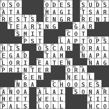 ACROSS 1. Bear (Spanish) 4. Lyric poems 8. Beer foam 12. _ moment's notice (2 wds.) 13. Wise men 14. Russian ruler of old 15. Musical pauses 18. Engineer (abbr.) 19. Painter Guido (1575-1642) 20. Pulling apart 22. Slender fish 23. Stricken, poetically 24. Small bed 25. Pacific Standard Time (abbr.) 26. Portable computers 30. Part of HMS, perhaps 33. Witty Wilde 36. Relating to the mouth 37. Mild oath 39. Scottish cap 40. California wine valley 41. Australian parrot (variant) 42. Eroded 44. Tired old horse 45. Hard copy producer 47. Mouth or opening 50. Commissioned mil. rank 51. 1994 drama film starring Jodie Foster 53. Basketball assoc. 54. Opts 57. Small Philippine buffalo 59. Jai ____ 61. Echolocation 63. Rendezvous 64. Not ill 65. One more than two 66. Friends 67. Hang loosely or laxly 68. Non-commissioned officer (abbr.) DOWN 1. Rowing implement 2. Proofreading order 3. Fertile tracts in a desert 4. Presage 5. Mild oath, euphamism for damn 6. Ovum 7. Title for a knight 8. Ski resort town in Vermont 9. One who makes use of a thing 10. Daniel's nick name 11. Indian title of respect (Mr.) 16. Pack (down) 17. Indian titles of respect 21. "Tell ____ the Marines!" 22. Republican Party 24. 4-wheeled motor vehicle 26. Unable to walk 27. Northwest Algerian city 28. Dad 29. Volcanic refuse 30. Assist 31. Russian composer Stravinsky 32. Indian skirt 34. Play the lead 35. Domesticated feline 38. Empty-headed or silly people 42. Car or cant ending 43. Words to Nanette 46. Beverage made from leaves 48. Vintage cars 49. In addition 52. Soviet premier 1918-24 53. Christmas carol 54. Give a ring to 55. Land elevation 56. Ketch in the Levant 57. Electrical Unit 58. Teachers' org. 59. Leather borer 60. Lion 62. River (Sp.)