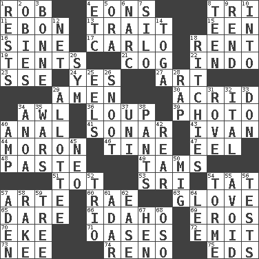 ACROSS 1. Director Reiner 4. Immeasurably long periods of time 8. Three (prefix) 11. Inky black, to poets 13. Distinguishing feature 15. Car or cant ending 16. Trig term 17. Monte _, Las Vegas Hotel/Casino 18. Monthly bill 19. Portable shelters 21. Gear tooth 22. Southeast Asian peninsula 23. Compass dir. 24. Consenting reply 27. Tate display 29. So be it 30. Bitter 34. Leather borer 36. Central Nebraska county 39. Picture 40. Of or related to the anus 41. Echolocation 43. _ the terrible 44. Person of subnormal intelligence 46. Prong on a fork 47. Snakelike fish 48. Thick mixture 49. Scottish caps 51. Small child 53. _ Lanka 54. Make lace 57. Johnson of "Laugh-In" 60. Actress Charlotte 63. Michael Jackson trademark 65. Have the gumption 66. Potato state 69. Greek god of love 70. Supplement with great effort 71. Fertile tracts in a desert 72. Give off 73. Born 74. Former U.S. Attorney General Janet 75. Begley and Asner DOWN 1. Musical pauses 2. Off-Broadway awards 3. Child's nurse 4. And so on (abbr.) 5. Mouth or opening 6. Drug cop 7. Grain storage tower 8. Adolescent 9. Tear apart 10. To the inside or interior of 12. Remaining after all deductions 14. Ancient Roman robe 18. Actors Guy, Robert Welles, and Clint 20. Symbol (abbr.) 25. Snakelike fish 26. Snout, nose 28. Strike 29. One to whom something is allotted 31. Be footloose 32. Slanted text style (abbr.) 33. Spanish title 34. Small Philippine buffalo 35. Armed conflicts 37. Corn or form start 38. Leg coverings 40. Electrical Unit 42. Located in or toward the back 45. Modern: prefix 50. Russian fighter aircraft 52. Musical group of three 54. Singer Mel 55. Prevent from happening 56. Trials 57. An important port of Yemen 58. Libertine 59. Relationship diagram 61. The sixth month of the Jewish calendar 62. Comfort 64. Area sheltered from the wind 67. Layer 68. Bear (Spanish)
