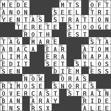 ACROSS 1. Ancient Persian 5. Mountains (abbr.) 8. Often (poetically) 11. Soon (poet.) 12. Sew up the eyelids of hawks and falcons 13. Three (prefix) 14. Gossips 17. Ski resort town in Vermont 19. Cigar-shaped 21. Moe Howard, for one 22. Writer of Portnoy's Complaint (1969) 23. Eastern Standard Time (abbr.) 24. Label 27. Female horse 29. R.R. building 32. Phillipine bananalike plant 34. Ewer handle 36. Tiny particle 37. Pale green bean 38. Period 39. California wine valley 40. Prepare for publication 41. Put into a specified state 42. Grain storage towers 43. Elected rep. 44. South Vietnam president (1954) 46. Curvy letter 47. Immediately 50. Mouths or openings 52. Full of chinks, cracks, or crevices 55. Sounds asleep 57. Cloudy 59. Put through a sieve 62. Bar 63. Like ___ of sunshine 64. Travel on an animal 65. Followers of ems 66. Acura sports coupe 67. Toward shelter DOWN 1. Fifth month 2. Compass dir. 3. Do not 4. Keyboard key 5. Was introduced to 6. Laconic 7. Narrow boards 8. "Beetle Bailey" pooch 9. Toadlike animal 10. Prong on a fork 12. Compass dir. 15. Scent 16. Bristle 18. Small child 20. Triplets 24. Lies 25. Remain 26. Street urchin 28. Having ears or earlike features 29. Showing deterioration from age 30. Traditional theme or motif 31. Collect or gather 33. Domesticated feline 35. Food allowance for one day 36. Black tropical American cuckoo 42. Don Adams' spy role 45. Greek god of love 47. Not either 48. Motion picture award 49. Puts on (as clothing) 51. Spanish missionary in California 52. Loose flowing garment 53. _ the terrible 54. Not women's 55. Filthy place 56. Travel by water 58. Saxophone 60. Binary compound 61. Born