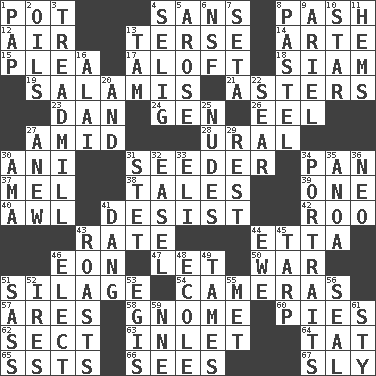 ACROSS 1. Plant holder 4. Without 8. Romantic infatuation 12. Atmosphere 13. Laconic 14. Johnson of "Laugh-In" 15. Entreaty 17. At or to great height 18. Thailand, formerly 19. Deli grouping 21. Michaelmas daisies 23. Daniel's nick name 24. Commissioned military rank (abbr.) 26. Snakelike fish 27. Among 28. Mountain range 30. Cuckoo 31. Sowing specialist 34. Baking dish 37. Cartoonist voice _ Blanc 38. Lies 39. Single 40. Leather borer 41. Cease 42. Friend of Pooh 43. Assign a rank or rating to 44. Singer James 46. A really long time 47. Allow 50. Armed conflict 51. Fodder prepared in a silo 54. Devices for capturing images 57. Ancient Greek god of war 58. Dwarf 60. Sliced desserts 62. Religious group 63. An arm off of a larger body of water 64. Make lace 65. Fast planes 66. Observes 67. Roguish DOWN 1. Infant food 2. Lubricates 3. Excercise machine 4. Former Milwaukee Brewers owner Bud 5. Came up 6. Science/research agcy. 7. Bristle 8. Soft color 9. Satellite of Uranus 10. Play the lead 11. Folds over and sews together 13. Scottish cap 16. Jai ____ 20. Also 22. Shrivel 25. Unclothed pictures 27. Afresh 29. Remainder 30. Nursemaid (var.) 31. Proofreading order 32. Artist's stand 33. Connecticut Ivy Leaguer 34. Likenesses of persons 35. Small Philippine buffalo 36. Modern: prefix 41. Mild oath, euphamism for damn 43. Ridicules or criticizes harshly 44. She-sheep 45. Canvas cover 46. Opt 48. Learning spot: Fr. 49. Makes less strong or intense 51. Backtalk 52. Angers 53. The front part of a cuirass 55. Was introduced to 56. Lick closed 59. Compass dir. 61. Filthy place
