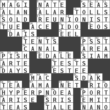 ACROSS 1. Wise men 5. Nathan's nickname 9. Oceans 13. Actor Alda or Thicke 14. Having or resembling wings 15. For Whom the Bell _____ 16. Exchanged or delivered for money 17. One who advocates reunion 19. Third day of the wk. 20. Adept person 21. Wedding promise 22. Greek goddess of the dawn 23. Raised platform 25. Snakelike fish 26. Portable shelters 30. Inconspicuous attention getter 34. Lessep's creation 35. Type of rug 36. Expression of disdain 39. Peak District village in England 42. Thailand, formerly 43. Johnson of "Laugh-In" 44. Trials 46. 24-hour periods 47. First name in cosmetics 48. Apple computer (short form) 51. Neighbor of Neb. 54. Afternoon social gathering 57. Wet nurse (var.) 58. Remaining after all deductions 60. River (Sp.) 62. Abnormally rapid or deep breathing 65. Sweet dark-red dessert wine 66. Get up 67. Indian titles of respect 68. Send forth 69. Afternoon social gatherings 70. Falsehood 71. Billionth: prefix DOWN 1. Vertical spar for supporting sails 2. Verbally 3. An organ shaped like a helmet 4. Indiana (abbr.) 5. Drug cop 6. Toward shelter 7. The 19th letter of the Greek alphabet 8. Bert's buddy 9. Boy, to dad 10. Writer Wiesel 11. In addition 12. Fast planes 15. Instrument 18. Binary compound 20. Toward the sea 24. Irritating cutaneous sensations 27. Compass dir. 28. Bit 29. Chalkboard 30. Went by 31. _ Lanka 32. Ocean 33. Scottish cap 36. Groovy apt. 37. Retirement account (abbr.) 38. Filthy place 40. French article 41. Eastern Standard Time (abbr.) 45. Trial 48. Female horse 49. Electrical Unit 50. 2nd pers. sing. pres. of can (arch.) 52. Scent 53. Japanese brewing company 54. Not this but _ 55. Jane of fiction 56. Capital of Western Samoa 58. Famous astronaut Armstrong 59. Relaxation 61. Von Bismarck 63. Curvy letter 64. Mouth or opening 65. Writing instrument