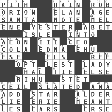 ACROSS 1. Heart or essence 5. Precipitation 9. Director Reiner 12. Constellation of myth 14. Flair 15. Mature 16. Before Barbara or Clara 17. Musical sound 18. Cartoonist voice _ Blanc 19. Compass dir. 20. Next before 23. Collude with 24. Capri or Wight 25. To the inside or interior of 27. A really long time 30. One more than two 32. Corporate head (abbr.) 33. Root beer relative 34. Pulitzer Prize-winning author Ferber 36. Australian flightless bird 38. Compass dir. 39. Raised railways 40. To separate or throw off 43. Choose 46. For fear that 48. Kenny Rogers chart-topper in '80 49. Actor Linden 51. Neckwear 52. Otherwise 53. Tall New Zealand timber tree 54. Proofreading order 56. To provide with a ceiling 58. Scheduled 61. Housemaid (var.) 64. Find the sum of 65. Play the lead 66. Tree or shrub in the Birch family 68. Whopper 69. One of the Great Lakes 70. Intended 71. French article 72. Hearing organs 73. Celtic language DOWN 1. Airs 2. SW Asia republic 3. Prong on a fork 4. Being at a high temperature 5. Monthly bill 6. _ vera 7. Of or pertaining to medicine 8. Compass dir. 9. Role for Stallone 10. Double curve, resembling the letter S 11. Waist strap 13. Negative votes 21. Writer Wiesel 22. Beer mug 23. Smallest unit of an element 24. _ tizzy (2 wds.) 26. Born 27. Adept person 28. Greek goddess of the dawn 29. Margarine 31. An arm off of a larger body of water 35. Aid 37. Mountain range 41. Begley and Asner 42. Sight organ 44. Silvers or Donahue 45. Scottish cap 47. False hair 48. Allow 50. A period of five years 53. Amusement-park features 55. Dutch treat 56. Give a ring to 57. Singer Brickell 59. Den 60. Ancient Greek god of war 61. The sixth month of the Jewish calendar 62. Not women's 63. Johnson of "Laugh-In" 65. Observe 67. Area sheltered from the wind