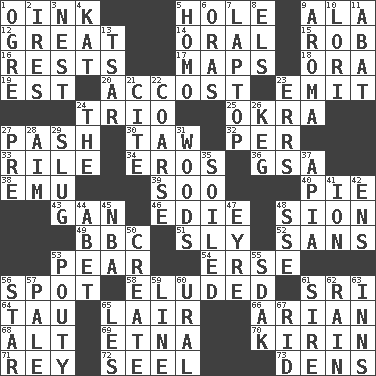 ACROSS 1. Pig sound 5. Opening into or through something 9. Insect wing 12. Relatively large 14. Spoken 15. Director Reiner 16. Musical pauses 17. Atlas contents 18. Mouth or opening 19. Eastern Standard Time (abbr.) 20. Buttonhole 23. Give off 24. Musical group of three 25. Gumbo ingredient 27. Romantic infatuation 30. The 23rd letter of the Hebrew alphabet 32. For each 33. Cause heat under the collar 34. Greek god of love 36. Girls' org. (abbr.) 38. Australian flightless bird 39. "Barney Miller" actor Jack 40. Sliced dessert 43. Separate the seeds from cotton 46. Singer Brickell 48. The Jewish people; Israel 49. English channel? 51. Stealthy 52. Without 53. Lightbulb-shaped fruit 54. Celtic language 56. Specific locale 58. Dodged 61. Indian title of respect (Mr.) 64. The 19th letter of the Greek alphabet 65. Den 66. Believer in; advocate of (suffix) 68. Keyboard modifier key 69. Inactive volcano in Sicily 70. Japanese brewing company 71. Marina Del _, California 72. Stitch closed the eyes of (a falcon) 73. Cub Scout units DOWN 1. Legendary monster 2. Angers 3. A home for chicks 4. Krazy ___ of comics 5. Same (prefix) 6. Mouths or openings 7. Portable computer 8. Raised railways 9. Scent 10. Australian parrot (variant) 11. Blind as ____ 13. Russian ruler of old 21. Quote 22. Unrefined 23. Blunders 24. Definite Article 26. Barrel 27. Before (prefix) 28. Direct toward a target or goal 29. Snaillike creature with no shell 31. Forest 35. Dirtied 37. Capital of Western Samoa 41. Electrically charged atom 42. Followers of ems 44. Collude with 45. Basketball assoc. 47. Jane of fiction 48. Compass dir. 50. Cause to be 53. Marked by pouting 55. Neighbor of Neb. 56. Play the lead 57. Diluted with white 59. Actor's bit 60. Mountain range 61. Beget 62. Precipitation 63. Taverns 65. French article 67. To free from