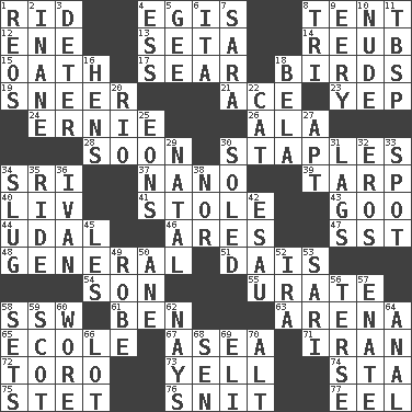 ACROSS 1. To free from 4. The front part of a cuirass 8. Portable shelter 12. Compass dir. 13. Bristle 14. Reuben's nickname 15. Pledge 17. Scorch 18. Avian creatures 19. Scornful expression 21. Adept person 23. Slangy assent 24. Bert's buddy 26. In the manner of 28. Within a short period 30. Paper fasteners 34. _ Lanka 37. Billionth: prefix 39. Canvas cover 40. 54 in ancient Rome 41. Took without asking 43. Thick or sticky substance 44. Allodial 46. Ancient Greek god of war 47. Fast jet (abbr.) 48. Commissioned military rank 51. Raised platform 54. Male child 55. A salt of uric acid 58. Compass dir. 61. Benjamin's nick name 63. Sports stadium 65. Learning spot: Fr. 67. Toward the sea 71. SW Asia republic 72. "Corrida" creature 73. Shout 74. R.R. building 75. Proofreading order 76. In a ____ (agitated or irritated) 77. Snakelike fish DOWN 1. Vintage cars 2. Silly 3. Prevent from occurring 4. Curvy letter 5. Unit of force equal to gravity 6. Call ___ day 7. "Two Mules for Sister ____" 8. Three (prefix) 9. Suggestive of the supernatural 10. Unadorned 11. Cook's measure (abbr.) 16. Coop moms 18. Actor Lugosi 20. _ de Janeiro 22. Feline 25. Immeasurably long periods of time 27. Fitting 29. Brizilian seaport 30. Having a sole or soles 31. Falls behind 32. Greek god of love 33. Specific locale 34. A hard, heavy blow 35. Travel on an animal 36. _ the terrible 38. Not either 42. He sold his birthright 45. French article 49. Loose flowing garment 50. A saturated hydrocarbon 52. Lyricist Gershwin 53. Indian skirt 56. Laconic 57. Maternal 58. Arranges properly for use 59. Highlander 60. Had on 62. Negative votes 64. Of or related to the anus 66. Car dealer's back yard 68. Elected rep. 69. Biblical high priest 70. The first octave above the treble staff