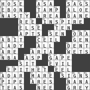 ACROSS 1. Flexible conduit 5. White ___ sheet 8. Sinks 12. Inky black, to poets 13. Pack (down) 15. _ vera 16. Difficult 18. Type of rug 19. Object of repulsion 20. Portuguese money of account (variant) 22. Heighten or intensify 24. Otherwise 26. "___ Little Indians" 27. Tenement units (abbr.) 28. Elected rep. 29. Mouth or opening 32. "This won't hurt ____!" 35. To provide with a ceiling 37. Commissioned mil. rank 38. Kenny Rogers chart-topper in '80 39. Everything 40. Undesirable depression on a surface 41. "We ___ not amused" (Victoria) 42. Operatic vocal solo 43. Soaks 44. Basketball assoc. 45. Cleo's killer 46. Open wide 49. Be seated 50. Morally bad or wrong 51. Curse 55. Snakelike fish 56. The sixth month of the Jewish calendar 57. Female horse 59. Attaches a signature 63. Corncob 64. Ancient Greek god of war 65. Grandmother 66. Afternoon social gatherings 67. Born 68. Jennifer or Joel DOWN 1. Layer 2. Chief or king in Benin or Nigeria 3. Distress signal 4. Plea 5. "One Day ___ Time" 6. Indian skirt 7. So be it 8. Unit of acoustic absorption 9. Having or resembling wings 10. Went 11. Perceive with the eye 14. Soft color 17. Sharp bark 21. Eastern Standard Time (abbr.) 23. Fenced enclosure 25. Fortification 28. Fodder prepared in a silo 29. Double curve, resembling the letter S 30. Monthly bill 31. Pismires 32. Actor Alda or Thicke 33. Sharp remark 34. The main thing one is thinking about 36. Connecticut Ivy Leaguer 40. Home 42. Respiratory problem 45. Small island 47. "___ Maria" 48. Sliced desserts 49. Fathers 51. Singer Brickell 52. Dad 53. Merit 54. Family _ (genealogy) 56. Fitting 58. Compass dir. 60. Slender fish 61. Compass dir. 62. Declare