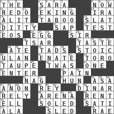 ACROSS 1. Definite Article 4. "Two Mules for Sister ____" 8. Immediately 11. Do over again 13. Supplementing with great effort 15. Lyricist Gershwin 16. Set down 17. Off limits 18. Narrow board 19. Short, simple song 21. Plant excrement 22. Trial 23. Greek goddess of the dawn 24. Ovum 27. Title for a knight 29. Russian ruler of old 30. Clothes sense 34. Had dinner 36. Bits 39. Unemotional 40. ____ Bator 41. Related on the mother's side 43. "Corrida" creature 44. Grayish beige 46. It was, poetically 47. Single 48. Keyboard key 49. Ache 51. Tired old horse 53. Attila the _ 54. White ___ sheet 57. Soon (poet.) 60. Marina Del _, California 63. Middle Eastern gold or silver currency 65. Trust 66. Sports stadium 69. Monthly bill 70. Pipe bend 71. Having a sole or soles 72. Suttee (variant) 73. Wing 74. Downhill vehicle 75. Actress Charlotte DOWN 1. Barter 2. Sun: prefix 3. Proofreads 4. Put into a specified state 5. Alias (abbr.) 6. Chest bones 7. Small Philippine buffalo 8. Mediterranean tributary 9. Mouths or openings 10. Electrical Unit 12. Baseball player Mel 14. Republicans 18. Ski resort town in Vermont 20. Consenting reply 25. Yard entry 26. Let have 28. ___ a Wonderful Life 29. 3-inch nail 31. Within a short period 32. Hoop that covers a wheel 33. Environmental prefix 34. Actor Alda or Thicke 35. Strained 37. Fool 38. Staphylococcus 40. Shoshoni 42. Son of Isaac 45. Period 50. Working for oneself (abbr.) 52. Pate de foie ____ 54. Approach 55. Before Barbara or Clara 56. Nick name for Arthur 57. Length times width 58. 1994 drama film starring Jodie Foster 59. Spanish pot 61. Greek god of love 62. Shout 64. Big collection agency 67. Born 68. Say or write further