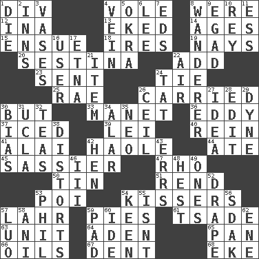 ACROSS 1. HTML Container Element 4. Short-tailed, large-bodied rat 8. Past tense of be (plural) 12. _ tizzy (2 wds.) 13. Supplemented with great effort 14. Eras 15. Follow as a consequence or result 18. Angers 19. Negative votes 20. French poetic form 22. Say or write further 23. Emitted 24. Make a knot 25. Actress Charlotte 26. Borne 30. With the exception that 33. French painter Edouard 36. Whirlpool 37. On the rocks 39. Flowery wreath 40. It's straight from the horse's mouth 41. Mountain range southwest of Kyrgyzstan 42. White Person, in Hawaii 44. Had dinner 45. More disrespectful 47. 17th letter of the Greek alphabet 50. Metal container 51. Tear apart 53. Luau course 54. Smoochers 57. Cowardly lion portrayer 59. Sliced desserts 61. Sadhe (variant) 63. A single undivided whole 64. Arabian gulf 65. Baking dish 66. Petroleums 67. Undesirable depression on a surface 68. Supplement with great effort DOWN 1. Expire 2. Lodging establishments 3. Flower holders 4. Distinctive style or manner 5. Gumbo ingredient 6. Area sheltered from the wind 7. Begley and Asner 8. Nomad 9. Mild oath 10. Marina Del _, California 11. Double-curved letter 16. One who uses or employs something 17. Inactive volcano in Sicily 21. A whole individual unit 22. Wind 24. Make lace 26. To provide with a ceiling 27. The main thing one is thinking about 28. Prepare for publication 29. Unit of force 30. Prejudice 31. Southern CA. univ. 32. Beverages made from leaves 34. Having or resembling wings 35. Modern: prefix 38. What propaganda does 42. Layer 43. Blunders 46. One more than two 48. Behest 49. Singles 52. Window treatment 53. Silvers or Donahue 54. Peachy ____! 55. Is not 56. Neighbor of Neb. 57. Nilotic language 58. Black tropical American cuckoo 59. Writing tablet 60. Binary compound 62. Compass dir.