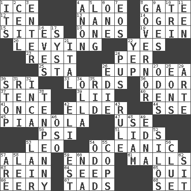 ACROSS 1. Frozen water 4. Medicinal plant 8. Yard entry 12. Nine, plus one 13. Billionth: prefix 14. Legendary monster 15. Settings 18. Singles 19. Distinctive style or manner 20. Imposing or collecting, as a tax 22. Consenting reply 23. Remainder 24. For each 25. R.R. building 26. Normal relaxed breathing 30. _ Lanka 33. Domineers 36. Scent 37. Portable shelter 39. Cards in a Roman deck? 40. Monthly bill 41. Single time 42. A person who is older than you are 44. Compass dir. 45. Player piano 47. Purpose 50. Air pressure measure (abbr.) 51. Hats (slang) 53. Lion 54. Pertaining to the sea 57. Actor Alda or Thicke 59. Inside; within (prefix) 61. Promenades 63. It's straight from the horse's mouth 64. Ooze 65. Fr. "Yes" 66. Suggestive of the supernatural 67. Small amounts or degrees 68. Arrange properly for use DOWN 1. It is 2. To provide with a ceiling 3. Keyboard key 4. At once, immediately (arch.) 5. Austrian-born American filmmaker Fritz 6. Single 7. Greek goddess of the dawn 8. Head of state? 9. Grows older 10. Three (prefix) 11. Car or cant ending 16. Nights before holidays 17. System (abbr.) 21. Slanted text style (abbr.) 22. Slangy assent 24. Product of festering 26. Singer Brickell 27. Lyric poems 28. Immeasurably long periods of time 29. Johnson of "Laugh-In" 30. Constrict 31. Painter Guido (1575-1642) 32. South American Indian 34. Water jar 35. To free from 38. 3-inch nail 42. Connecticut Ivy Leaguer 43. Governing power 46. Bear (Spanish) 48. Thailand, formerly 49. Pulitzer Prize-winning author Ferber 52. Grain storage towers 53. Den 54. Wrote a lyric poem 55. 911 reaches them 56. A slight indication 57. "We ___ not amused" (Victoria) 58. Area sheltered from the wind 59. Eastern Standard Time (abbr.) 60. Teachers' org. 62. Be seated