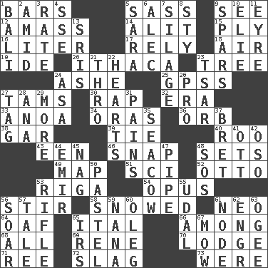 ACROSS 1. Drinking establishments 5. Backtalk 9. Perceive with the eye 12. Collect or gather 14. Came down and settled, as after flight 15. Travel a route regularly 16. 61 cubic inches 17. Have trust in 18. Atmosphere 19. Binary compound 20. New York city 23. Relationship diagram 24. American tennis player Robert 25. Global Positioning Systems (abbr.) 27. Scottish caps 30. Reproach for some lapse or misdeed 32. Epoch 33. Small Philippine buffalo 34. Mouths or openings 36. Globe 38. Slender fish 39. Neckwear 40. Friend of Pooh 43. Car or cant ending 46. Fastener 48. Arranges properly for use 49. Atlas unit 51. _-fi 52. Von Bismarck 53. Capital of Latvia 54. Musical composition 56. Use a spoon 58. Frozen precipiation fell 61. Modern: prefix 64. Clumsy lout 65. Slanted text style (abbr.) 66. Amid 68. Everything 69. French philosopher Descartes 70. Inn 71. Portuguese money of account (variant) 72. Volcanic refuse 73. We are DOWN 1. Indonesian resort city 2. Among 3. Pace 4. Compass dir. 5. "Two Mules for Sister ____" 6. Actor Baldwin 7. Fodder prepared in a silo 8. Filthy place 9. Practice fights 10. Writer Wiesel 11. Jane of fiction 13. Indian titles of respect 21. Through, poetically 22. Centers of feelings and intuitions 23. Russian ruler of old 24. White ___ sheet 26. Adept person 27. Label 28. Santa ___, CA 29. Greater amount 31. Aches 35. Manatee 37. Cy Young winner Saberhagen 41. Baseball player Mel 42. Bear (Spanish) 44. Arab leader 45. Tired old horse 47. Corncob 48. Distress signal 50. Soft color 53. Firearm 55. Allodial 56. Fly high 57. Falsehood 59. Nanny 60. Cassini of fashion 61. Thickened enlargement 62. Engineer (abbr.) 63. Double curve, resembling the letter S 65. Big collection agency 67. Cut the grass