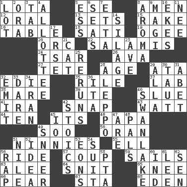 ACROSS 1. Globular water bottle used in Asia 5. Compass dir. 8. So be it 12. Taken by mouth 13. Puts into a specified state 15. Libertine 16. Eating place 18. Suttee (variant) 19. Double curve, resembling the letter S 20. The grampus (Milton) 22. Deli grouping 24. Russian ruler of old 26. Actress Gardner 27. Wig 28. Grow older 29. _ moment's notice (2 wds.) 32. Singer Brickell 35. Cause heat under the collar 37. Experiment locale 38. Female horse 39. Shoshoni 40. Turn sharply 41. Lyricist Gershwin 42. Fastener 43. Electrical Unit 44. "___ Little Indians" 45. It is 46. Dad 49. "Barney Miller" actor Jack 50. NW Algerian seaport 51. Fools 55. Pipe bend 56. Travel on or in a vehicle 57. Overturn; upset 59. Moves on water 63. Toward shelter 64. In a ____ (agitated or irritated) 65. Leg joint 66. Lightbulb-shaped fruit 67. R.R. building 68. Locale of original sin DOWN 1. Car dealer's back yard 2. Mouth or opening 3. Keyboard key 4. One to whom something is allotted 5. Curvy letter 6. Oceans 7. Singer James 8. Scent 9. Wise men 10. Supplements with great effort 11. Born 14. Fodder prepared in a silo 17. Celtic language 21. Domesticated feline 23. "___ Maria" 25. Summer TV shows 28. City in Syria 29. Silent film actress Nazimova 30. Tense 31. Collude with 32. Give off 33. Have the gumption 34. SW Asia republic 36. Call ___ day 40. Tchaikovsky ballet 42. Unemotional ones 45. Electrically charged atom 47. "We ___ not amused" (Victoria) 48. Friends 49. Scornful expression 51. The longest river in the world 52. The main thing one is thinking about 53. Immeasurably long periods of time 54. Set or collection 56. Hit sharply and swiftly 58. Parent Teacher Association (abbr.) 60. Indiana (abbr.) 61. Area sheltered from the wind 62. Elected rep.