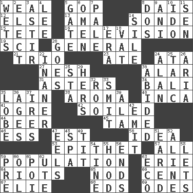 ACROSS 1. Welt 5. Grand Old Party 8. Raised platform 12. Otherwise 13. Nursemaid (var.) 14. Something which is sent 15. Wig 16. Boob tube 19. _-fi 20. Commissioned military rank 21. Musical group of three 23. Had dinner 24. _ moment's notice (2 wds.) 27. Tender 30. Having or resembling wings 31. Michaelmas daisies 34. Indonesian resort city 35. (Had) reclined 38. Scent 40. South American Indian 41. Legendary monster 42. Dirtied 44. Fermented drink made from hops 45. Not wild 46. Curvy letter 47. Eastern Standard Time (abbr.) 50. It may be bright or harebrained 53. Curse 57. 100% 59. Census information 63. One of the Great Lakes 64. Disturbances 65. Allow head to fall sleepily 66. Penny 67. Writer Wiesel 68. Begley and Asner 69. Lyric poems DOWN 1. Soaks 2. Voters do this 3. Having gotten out of bed 4. Area sheltered from the wind 5. Yard entry 6. Presage 7. Diluted with white 8. Two (Sp.) 9. Black tropical American cuckoo 10. Wedding promise 11. Elected rep. 14. Drop; flow; fall 17. Epoch 18. Large container 20. Moves 22. Sillier 24. Actor Alda or Thicke 25. Baby powder 26. Operatic vocal solo 28. R.R. building 29. Possessive pronoun 30. Tolerated 32. Friend of Pooh 33. Stricken, poetically 35. Ear part 36. Matures 37. Angers 39. Wing 43. Give off 47. Snakelike fish 48. Health resort 49. Teat (slang) 51. Having ears or earlike features 52. Place in a line 54. Prong on a fork 55. Parka part 56. Conclusions 58. Allows 59. Before (prefix) 60. Lubricate 61. Luau course 62. Shoshoni 63. Environmental prefix