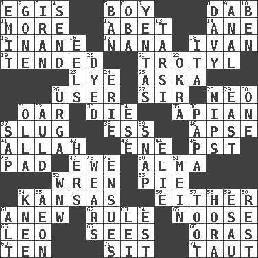 ACROSS 1. Armor plate that protects the chest 5. Male child 8. Apply (a substance) by light strokes 11. Greater amount 12. Collude with 14. A saturated hydrocarbon 15. Lacking in sense or substance 17. Grandmother 18. _ the terrible 19. Watched over 21. TNT 23. Sodium hydroxide 25. "____ silly question..." 26. One who uses or employs something 27. Title for a knight 28. Modern: prefix 31. Boat paddle 33. Pass on 35. Bee-related 37. Strike heavily 38. Double-curved letter 40. Domed church section 41. Assad's deity 43. Compass dir. 45. Pacific Standard Time (abbr.) 46. Groovy apt. 47. She-sheep 50. _ mater 52. Songbird 53. Sliced dessert 54. Sunflower state 56. One or the other of two 61. Afresh 62. Governing power 65. Trap for birds or small mammals 66. Lion 67. Observes 68. Mouths or openings 69. Nine, plus one 70. Be seated 71. Strained DOWN 1. Give off 2. Went 3. SW Asia republic 4. Transmit 5. Bar 6. Chief or king in Benin or Nigeria 7. Gossips 8. _ Jones' Locker 9. Of or related to the anus 10. Benjamin's nick name 13. Tarsus (plural) 16. Snakelike fish 18. Call ___ day 20. Colored 22. Gumbo ingredient 24. One of the Great Lakes 26. Capital and largest city of Mongolia 28. Cuts off 29. 90 degrees 30. Single 31. Rounded earthenware pot or jar 32. Old (Scot.) 34. Compass dir. 36. Dad 37. Plant excrement 39. Fastener 42. Possessive pronoun 44. Writer Wiesel 48. Erodes 49. Takes place subsequently 51. Count _ (2 wds.) 52. Compass dir. 54. Leg joint 55. A really long time 57. A blast of a horn 58. Israeli folk dance 59. Son of Isaac 60. Relief 61. Keyboard modifier key 63. Flowery wreath 64. Eastern Standard Time (abbr.)