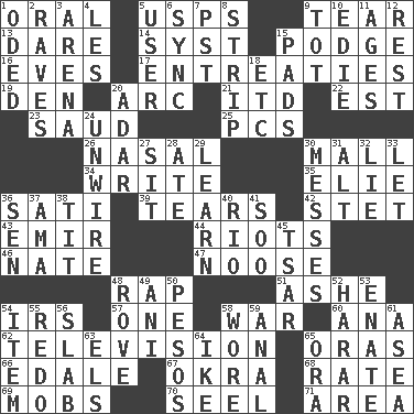 ACROSS 1. Taken by mouth 5. United States Postal Service (abbr.) 9. Separate forcefully 13. Have the gumption 14. System (abbr.) 15. Plash 16. Nights before holidays 17. Pleas 19. Lair 20. Curve 21. It would 22. Eastern Standard Time (abbr.) 23. Saudi Arabian king (1953-1964) 25. Personal Computers (abbr.) 26. Rhinal 30. Promenade 34. Compose 35. Writer Wiesel 36. Suttee (variant) 39. Separates forcefully 42. Proofreading order 43. Arab leader 44. Debaucheries 46. Nathan's nickname 47. Trap for birds or small mammals 48. Reproach for some lapse or misdeed 51. American tennis player Robert 54. Big collection agency 57. Single 58. Armed conflict 60. Santa ___, CA 62. Boob tube 65. Mouths or openings 66. Peak District village in England 67. Gumbo ingredient 68. Pace 69. Crowds into 70. Stitch closed the eyes of (a falcon) 71. Length times width DOWN 1. Wrote a lyric poem 2. All-night dance parties 3. Sports stadium 4. French article 5. One who uses or employs something 6. Synchronize (abbr.) 7. Pacific Standard Time (abbr.) 8. Remove all contents or possession from 9. Small child 10. Singer Brickell 11. Eras 12. Repose 15. Groovy apts. 18. And so on (abbr.) 20. The sixth month of the Jewish calendar 24. Undo the wiring of 27. Be seated 28. Had dinner 29. Memorize 30. Makes clutter 31. Keyboard modifier key 32. Whopper 33. Allow 36. Elected rep. 37. Housemaid (var.) 38. Teat (slang) 40. _ de Janeiro 41. "Barney Miller" actor Jack 45. Russian ruler of old 48. Be footloose 49. Black tropical American cuckoo 50. Mexican monetary units 52. Ethiopian city, capital of Harari 53. Related on the mother's side 54. Detail 55. Make new 56. Broad, flat, thick piece 58. Had on 59. Of or related to the anus 61. At sea 63. Raised railways 64. Eisenhower's nickname 65. Mouth or opening
