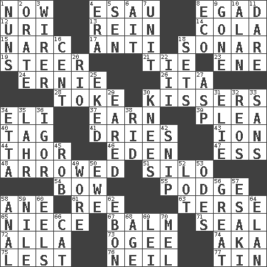 ACROSS 1. Immediately 4. He sold his birthright 8. Mild oath 12. RI univ. 13. It's straight from the horse's mouth 14. Root beer relative 15. Drug cop 17. Opposed to 18. Underwater navigation system 19. Bull 21. Neckwear 23. Compass dir. 24. Bert's buddy 26. Call ___ day 28. Casino tip 30. Smoochers 34. Biblical high priest 37. Merit 39. Entreaty 40. Label 41. Frees from moisture 43. Electrically charged atom 44. Son of Odin 46. Paradise 47. Double-curved letter 48. Moved like an arrow 51. Grain storage tower 54. Arrow shooter 55. Plash 58. One (Scot) 61. To sift 63. Laconic 65. Sibling's daughter 67. Lip ointment 71. Lick closed 72. Silent film actress Nazimova 73. Double curve, resembling the letter S 74. Alias (abbr.) 75. For fear that 76. Famous astronaut Armstrong 77. Metal container DOWN 1. Religious women 2. Speak pompously 3. One who wires 4. Epoch 5. Elected rep. 6. Small island 7. A single undivided whole 8. Environmental prefix 9. Went 10. Actor Alda or Thicke 11. Have the gumption 16. Penny 18. Puts into a specified state 20. River (Sp.) 22. One more than two 25. Supplemented with great effort 27. Cleo's killer 29. Having ears or earlike features 30. Leg joints 31. Writer Wiesel 32. Vintage cars 33. Without 34. Singer James 35. Cowardly lion portrayer 36. Composer Stravinsky 38. To free from 42. Clip 45. Director Reiner 49. Had on 50. She-sheep 52. Car dealer's back yard 53. Lyric poems 56. Relatively large 57. 1973 Nobel Price Winner (Physics) Leo 58. Of or related to the anus 59. The longest river in the world 60. Snakelike fish 62. Inky black, to poets 64. Style 66. Feline 68. Ripen 69. Luau accessory 70. Cartoonist voice _ Blanc
