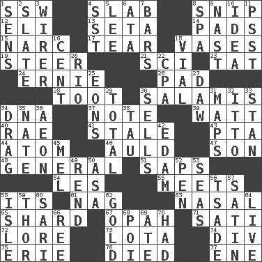 ACROSS 1. Compass dir. 4. Broad, flat, thick piece 8. Sever or remove by pinching or nipping 12. Connecticut Ivy Leaguer 13. Bristle 14. Writing tablets 15. Drug cop 17. Pull apart 18. Flower holders 19. Guide 21. _-fi 23. Make lace 24. Bert's buddy 26. Groovy apt. 28. A blast of a horn 30. Deli grouping 34. Heredity factor (abbr.) 37. Make mention of 39. Electrical Unit 40. Actress Charlotte 41. Having lost freshness 43. Parent Teacher Assoc. 44. Smallest unit of an element 46. Old (Scot.) 47. Male offspring 48. Commissioned military rank 51. Plant excrements 54. French article 55. Confronts 58. ___ a Wonderful Life 61. Tired old horse 63. Rhinal 65. Pottery fragment 67. Brightly colored fish 71. Suttee (variant) 72. Old wives' tales, e.g. 73. Globular water bottle used in Asia 74. HTML Container Element 75. 4th largest of the Great Lakes 76. Passed on 77. Compass dir. DOWN 1. Elected reps. 2. Chalkboard 3. One who wires 4. Fast jet (abbr.) 5. Area sheltered from the wind 6. _ moment's notice (2 wds.) 7. Oblong pieces of solid material 8. Health resort 9. Political cartoonist Thomas 10. The content of cognition 11. Inconspicuous attention getter 16. Penny 18. Small bottle 20. _ de Janeiro 22. Accounting whiz (abbr.) 25. Immeasurably long periods of time 27. Obsolete 29. Add up to 30. Makes a sale 31. Atlas contents 32. "Tell ____ the Marines!" 33. Comedian Laurel of Laurel & Hardy 34. To draw with force 35. Nathan's nickname 36. A really long time 38. The 19th letter of the Greek alphabet 42. Dutch treat 45. Cartoonist voice _ Blanc 49. Tear apart 50. White ___ sheet 52. Writing instrument 53. Oceans 56. Sadhe (variant) 57. Smooth fabric 58. Capri or Wight 59. Son of Odin 60. Indian skirt 62. Aureate 64. Moving, as bait 66. To sift 68. Luau course 69. Had dinner 70. Possessed