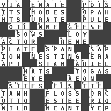 ACROSS 1. By way of 4. Maternal 9. Plant holders 13. It is 14. Methods 15. Brightly colored fish 16. Mountains (abbr.) 17. A salt of uric acid 18. Whimper 19. Lubricate 21. Madame (abbr.) 22. Honkers 24. Sty mamas 26. Myrna of the movies 27. Thespian 29. French philosopher Descartes 30. Food holder 31. Connect, as a bridge 33. Plant excrement 36. Electrically charged atom 37. Snuggling 40. Period 41. Fitting 42. Comedian Laurel of Laurel & Hardy 43. Satellite of Uranus 45. Floor coverings 47. Ancient Roman robes 48. Night before a holiday 49. A really long time 50. Locates 52. Raised railways 54. Standoff 56. Hyperbolic tangent 57. Soft thread for cleaning between teeth 59. The grampus (Milton) 61. Von Bismarck 62. First name in cosmetics 63. _ de Janeiro 64. Rampant 65. Intended 66. Slangy assent DOWN 1. Zeal 2. "Tell ____ the Marines!" 3. Aide 4. Australian flightless bird 5. Typical standards 6. First of billions? 7. False hair 8. Compass dir. 9. Wimpy's pal 10. Musical composition 11. Story 12. A female animal or person 20. Spoils 22. American astronaut and politician John 23. Period of immesurable duration 25. Songbird 27. Capital of Western Samoa 28. Hoof sound 29. Precipitation 31. Fast planes 32. Parent Teacher Association (abbr.) 33. Signiory (variant) 34. Type of rug 35. Friends 38. _____ Park, CO 39. Yard entry 44. Carrot, for example 45. Mode 46. "___ Maria" 49. NE Netherlands city 50. Suttee (variant) 51. International (abbr.) 52. Otherwise 53. Globular water bottle used in Asia 55. 4th largest of the Great Lakes 56. Pull behind 57. Opposite of masc. 58. Put into a specified state 60. Police officer (slang)