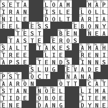 ACROSS 1. Stalk of a moss capsule 5. Rich soil 9. Atlas unit 12. SW Asia republic 13. Capri or Wight 14. Hang loosely or laxly 15. Mediterranean tributary 16. Stupid person 17. Operatic vocal solo 18. Snakelike fish 19. Double-curved letter 21. Black 22. Trial 24. Benjamin's nick name 26. Teachers' org. 27. Clothes sense 28. Greek god of love 29. Table seasoning 30. Proceeds 32. Housemaid 36. Relationship diagram 37. Whopper 38. Painter Guido (1575-1642) 39. Domed church section 40. Watches over 42. Taverns 43. Snaillike creature with no shell 44. Elude 46. Pacific Standard Time (abbr.) 49. Sep. follower 50. Grandmother 51. Composer Copland 53. Baseball player Mel 54. Feline 57. Comedian Laurel of Laurel & Hardy 58. Christmas carol 61. Pale green bean 62. Periodic rise and fall of the sea level 63. Mitch Miller's instrument 64. A distinct part 65. Compass dir. 66. Mild oath, euphamism for damn 67. Centimeter-gram-second unit of force DOWN 1. Trig term 2. One of the Great Lakes 3. Baron Munchausen's specialties 4. A saturated hydrocarbon 5. Hats (slang) 6. Bear (Spanish) 7. 100% 8. Was introduced to 9. Person of subnormal intelligence 10. Place in a line 11. Beach, in Buenos Aires 14. Experiment locale 19. Eastern Standard Time (abbr.) 20. Proofreading order 21. Followers of ems 23. First name in cosmetics 24. A special lineage 25. Greek goddess of the dawn 27. Canvas cover 28. Supplementing with great effort 29. R.R. building 31. Eskimo relative 32. Believer in; advocate of (suffix) 33. Ananias' fault 34. Queen of England 1702-14 35. Part of HMS, perhaps 40. Affectionate concern, for short 41. Emitted 43. Boy, to dad 45. Large container 46. Thick mixture 47. Smooth fabric 48. Exchange 52. Single 53. Cassini of fashion 55. So be it 56. Not wild 58. Lower and raise head in agreement 59. Chief or king in Benin or Nigeria 60. Period of immesurable duration 61. Hat (slang)